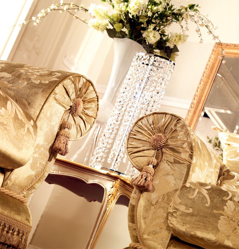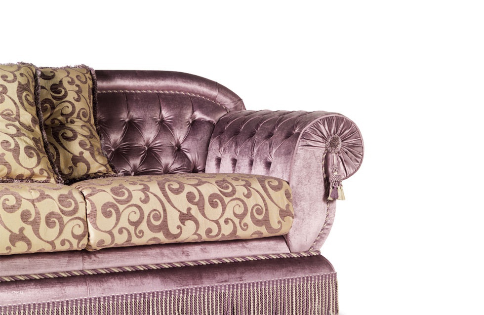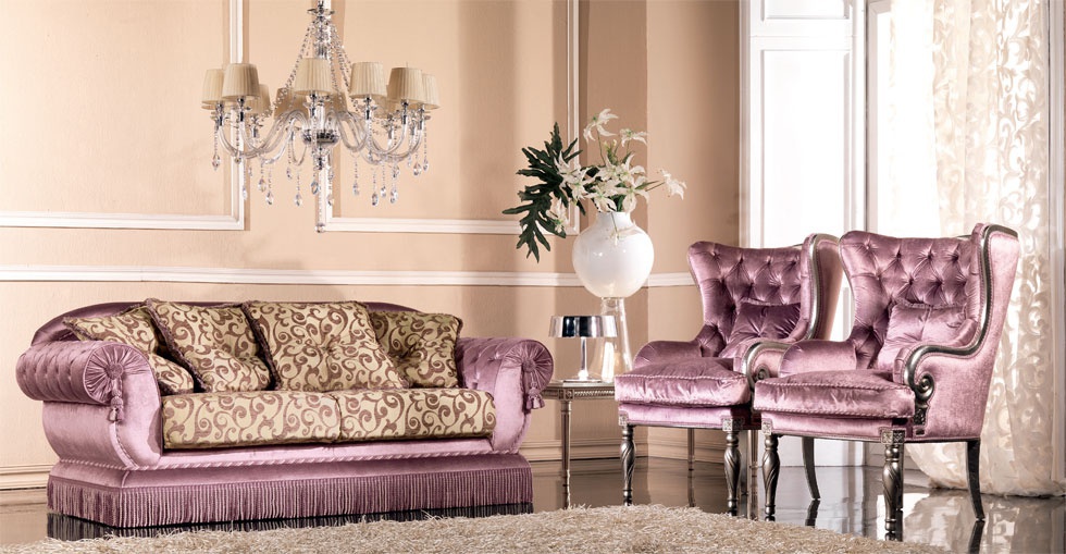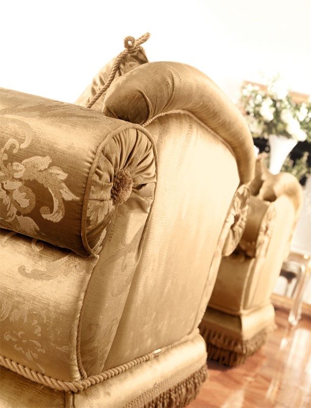 Otello sofa set from the Italian manufacturer Keoma Salotti. The model consists of sofa, chairs with soft back and armrests and a round coffee table. Carried on the frame of natural wood. Upholstery textile from the company portfolio. Compliment the design of your decorative pillows with down. Set is made in a classic style.