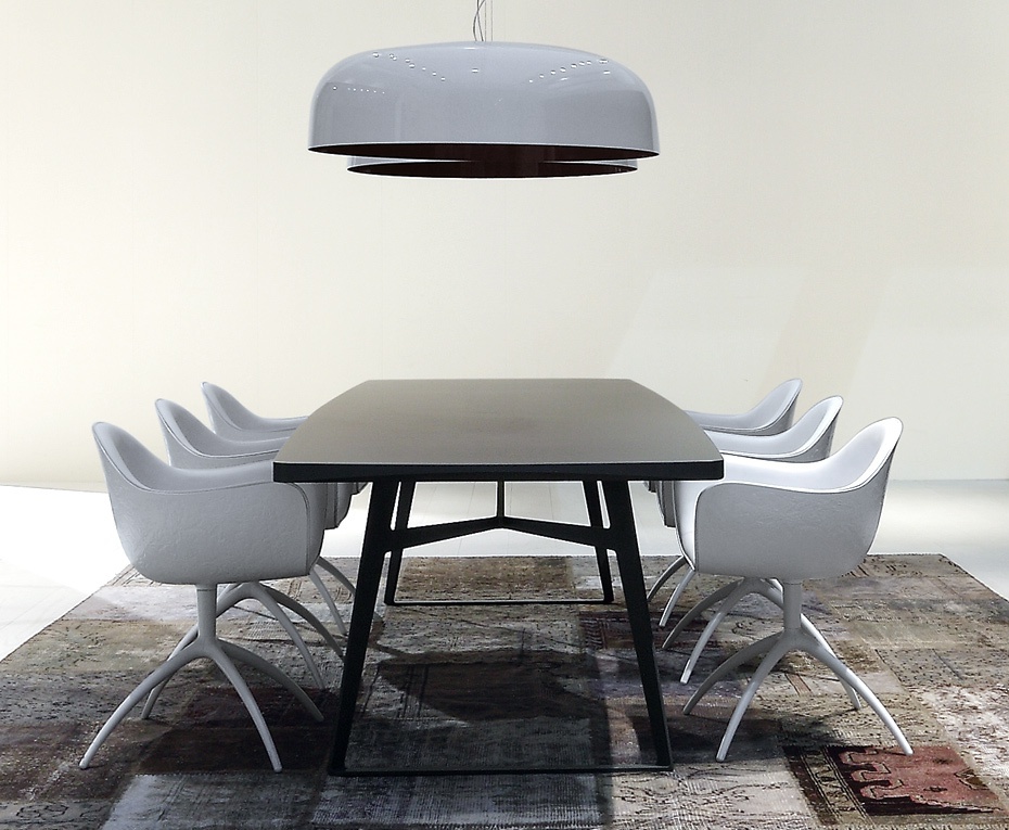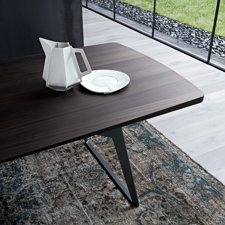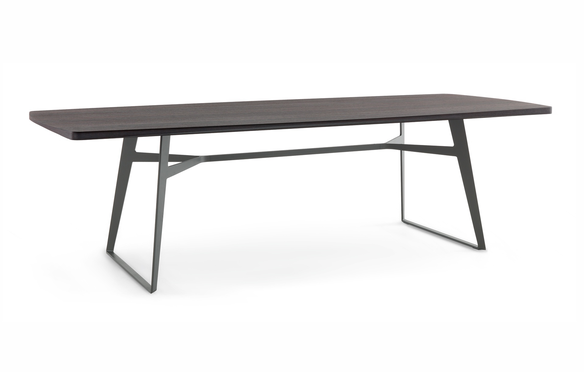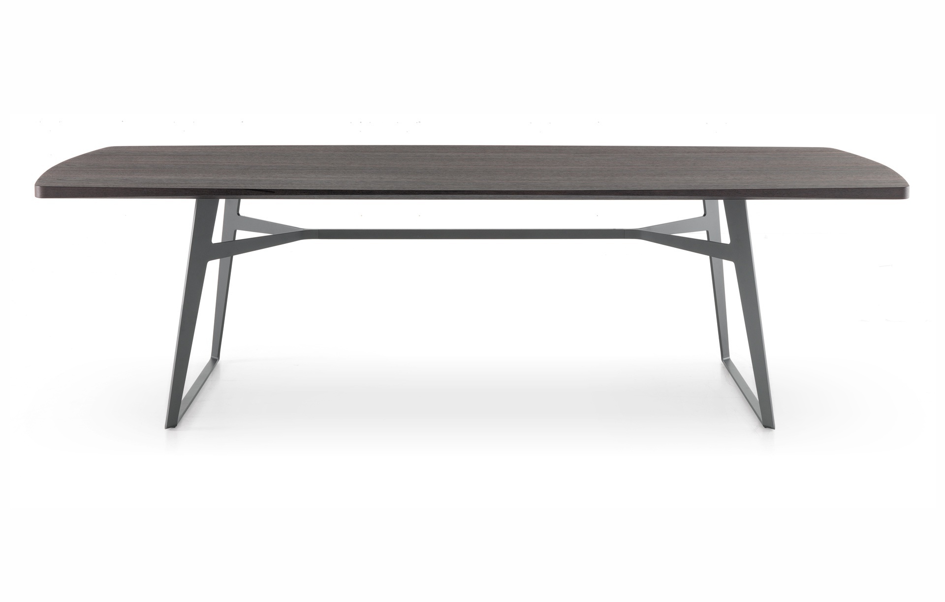 The Clipper dining table by Italian manufacturer Poliform. Table with metal legs, the table top is made from solid wood. Countertop color brown, legs dark gray. The shape of the countertop rectangular with slightly rounded edges. The modern style of execution.