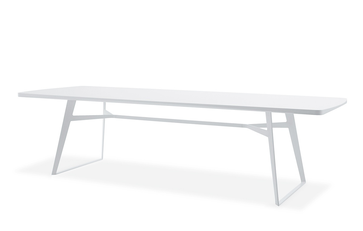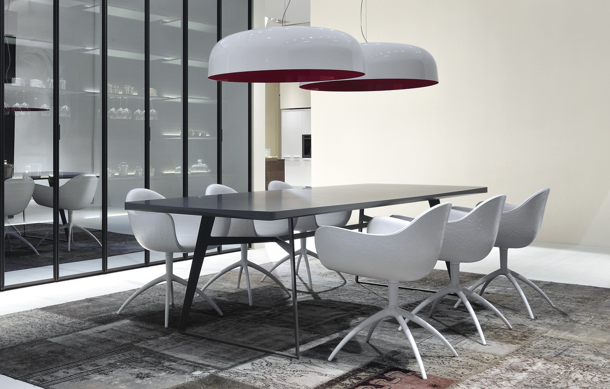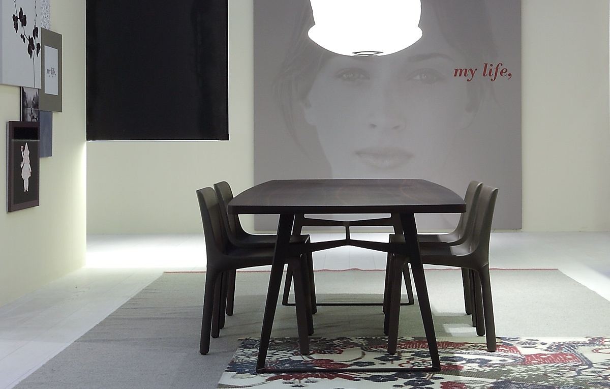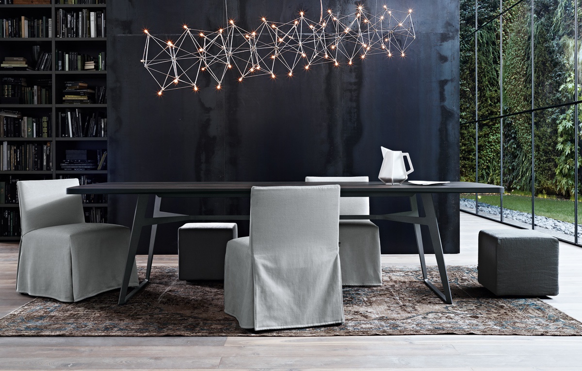 The Clipper dining table by Italian manufacturer Poliform. Table with metal legs, the table top is made from solid wood. Countertop color brown, legs dark gray. The shape of the countertop rectangular with slightly rounded edges. The modern style of execution.