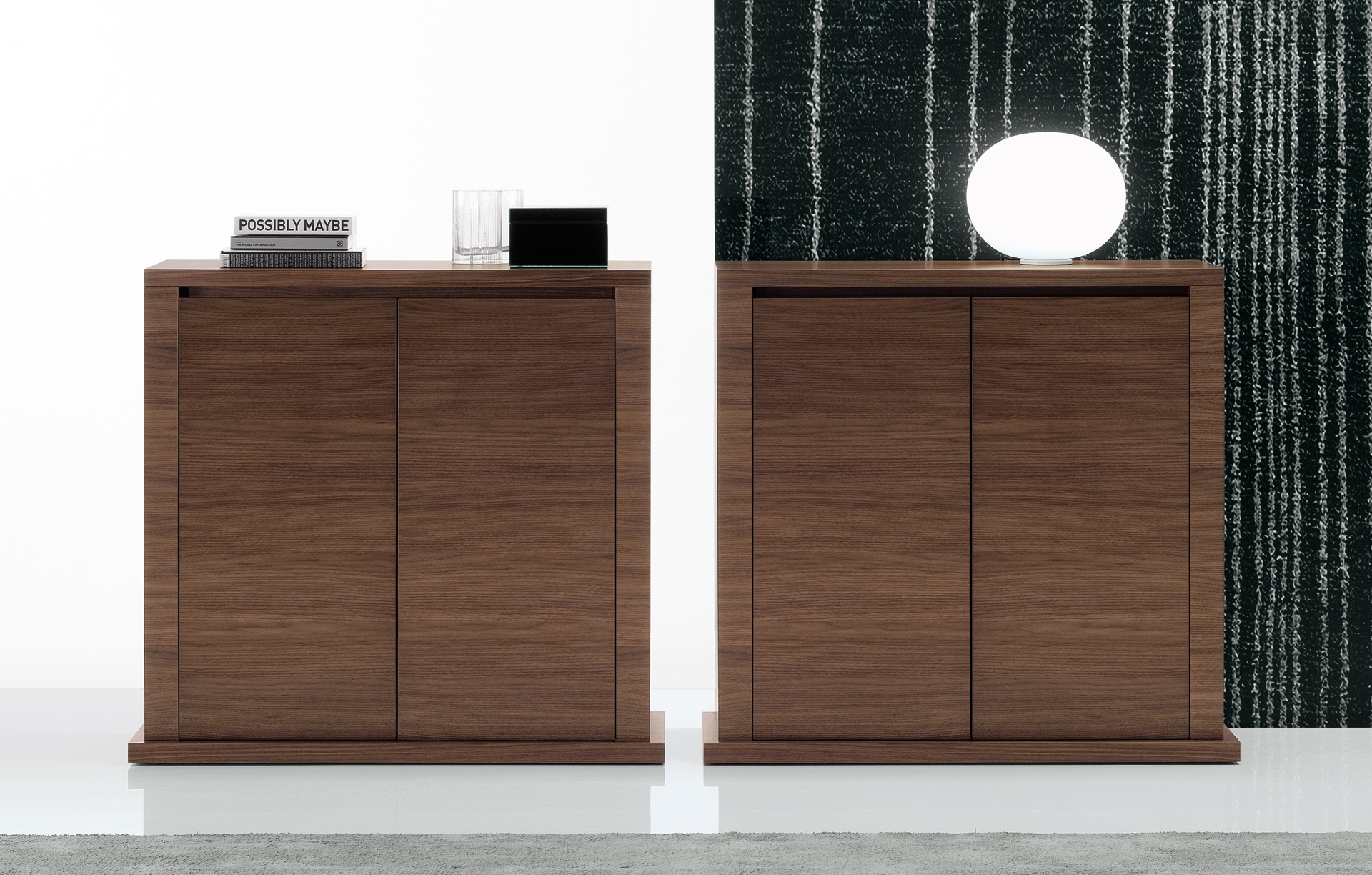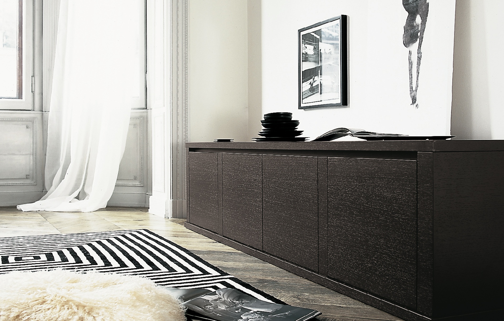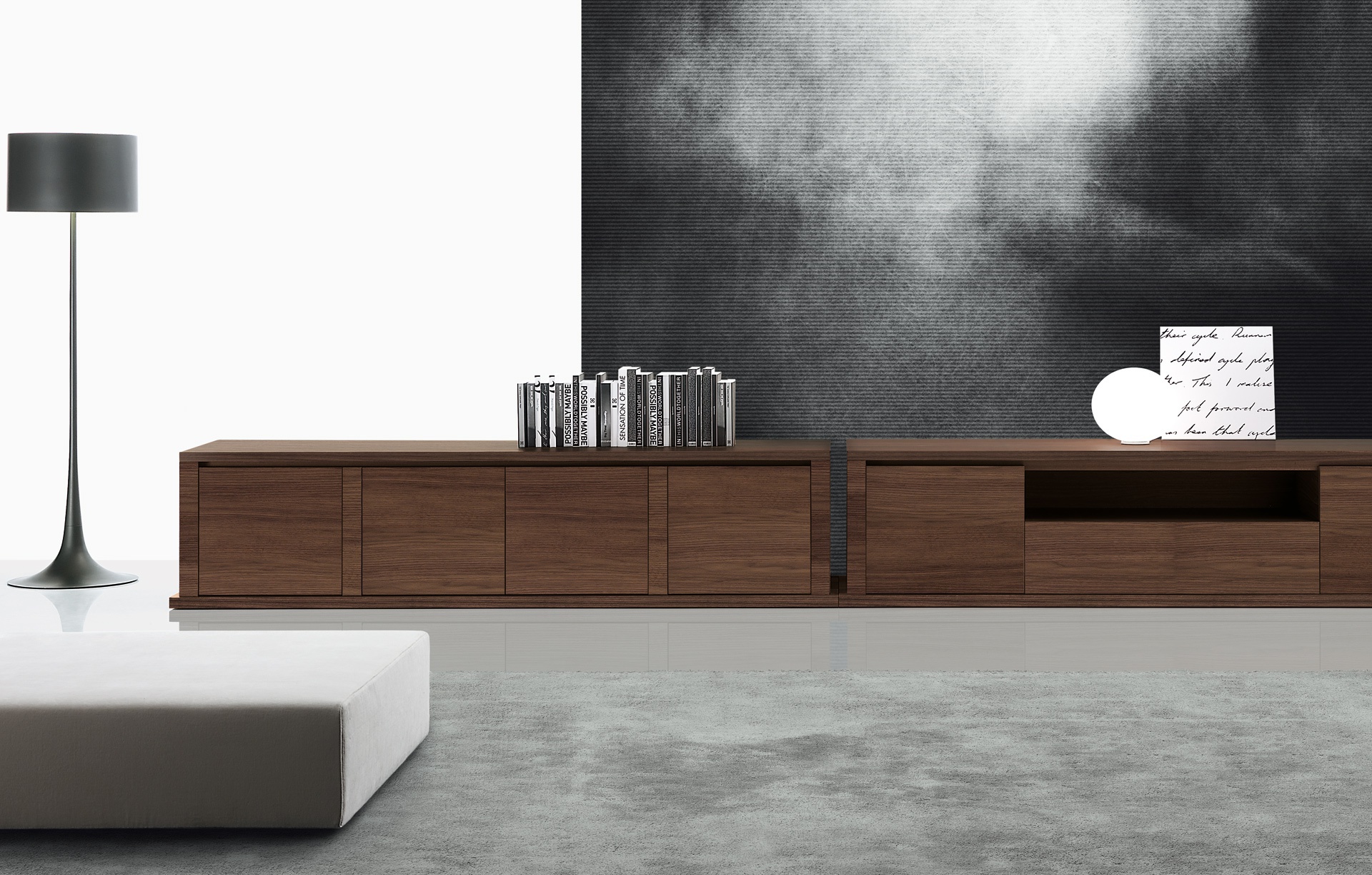 Stand of rectangular Teia Italian manufacturer Poliform. The Cabinet is equipped with roomy compartments, easy-close drawers and sliding shelves for small items. Factory offers several options of finishes: Matt lacquer (27 different colors), laminate color - walnut and bog oak. Materials resistant to moisture and scratches. The factory guarantees the quality of materials, reliability and long life of the furniture. The modern style of execution.