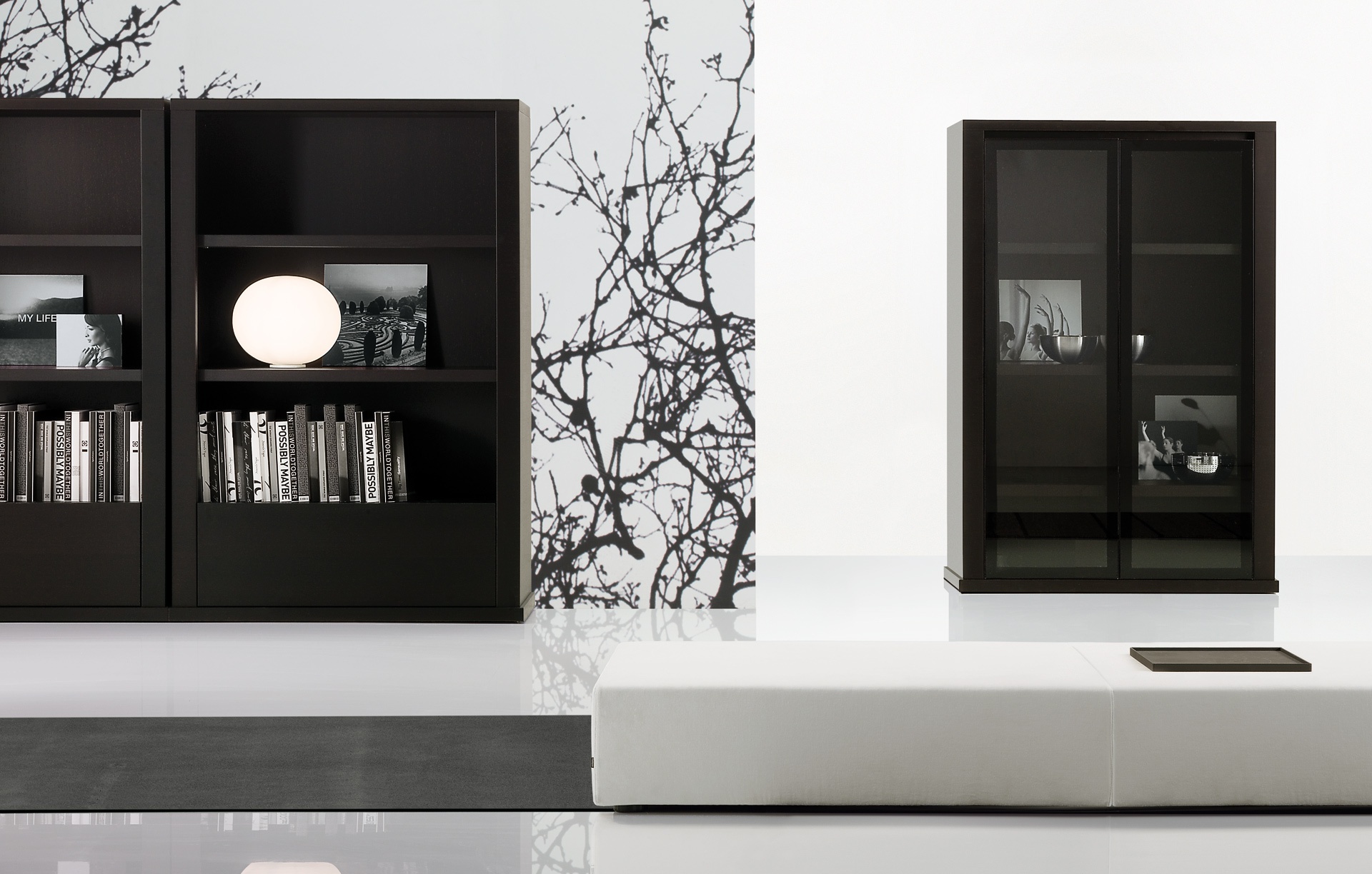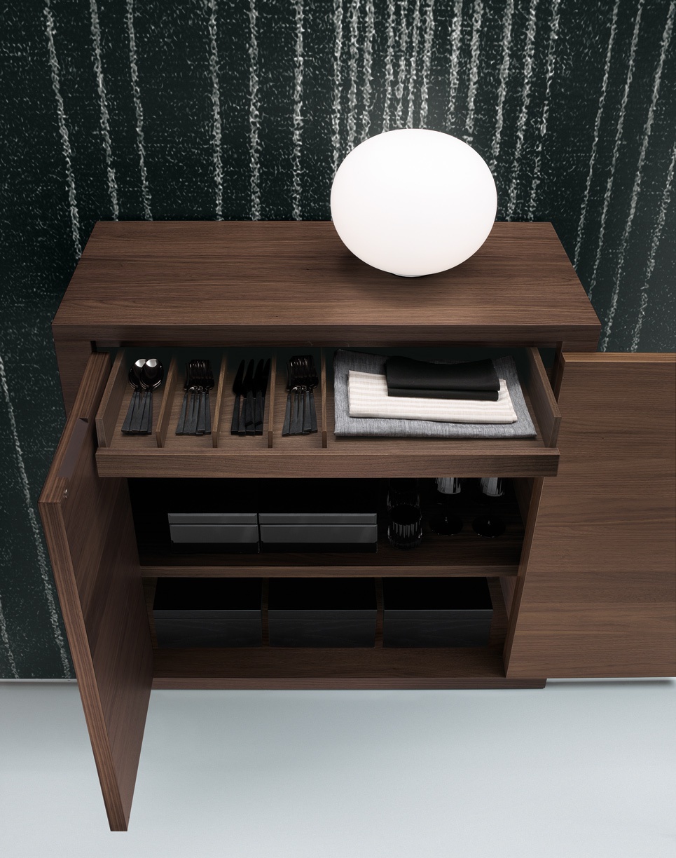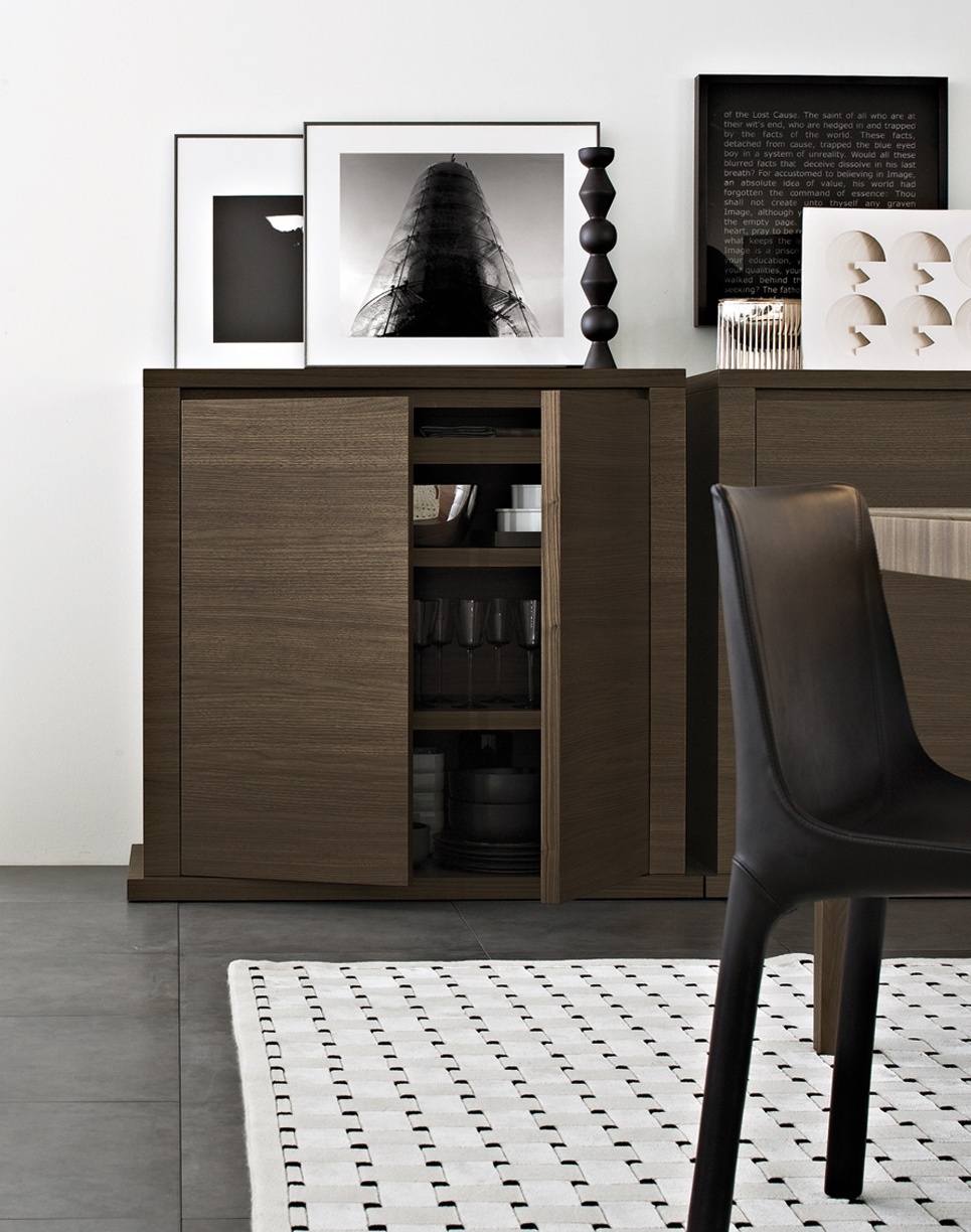 Stand of rectangular Teia Italian manufacturer Poliform. The Cabinet is equipped with roomy compartments, easy-close drawers and sliding shelves for small items. Factory offers several options of finishes: Matt lacquer (27 different colors), laminate color - walnut and bog oak. Materials resistant to moisture and scratches. The factory guarantees the quality of materials, reliability and long life of the furniture. The modern style of execution.