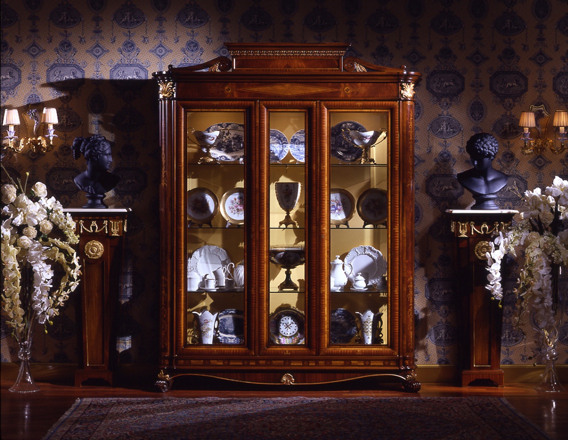Showcase from Italian producer Armando Rho. Tricuspid model. The frame is made from solid wood. Shutters and shelves made of transparent glass. Accessories metal. Finish - gloss lacquer. Carved elements and gold-plated.
