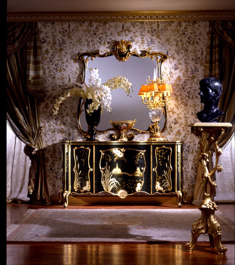 Sideboard from Italian producer Armando Rho. The model is made in classic style. The frame and legs of the array. The surface is covered with black lacquer and gilding. The unusual design gives the carving and painting made by hand.