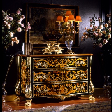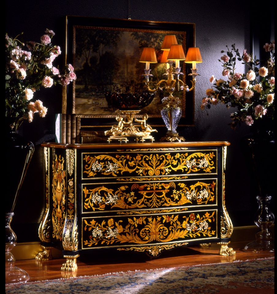 A chest of drawers from the Italian producer Armando Rho. Includes three drawers. Material - solid wood. The facade and side panels with decorative handmade paintings. Finish to be selected from a catalog company. Features attached legs curly shape.