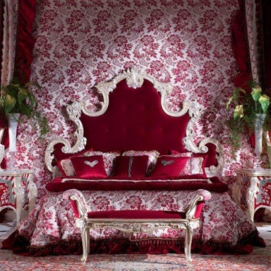 Double bed from Italian manufacturer Armando Rho. Model with high headboard. The frame is solid. Option finishes in the catalog of the company. Textile upholstery in red. The decoration is hand carved.