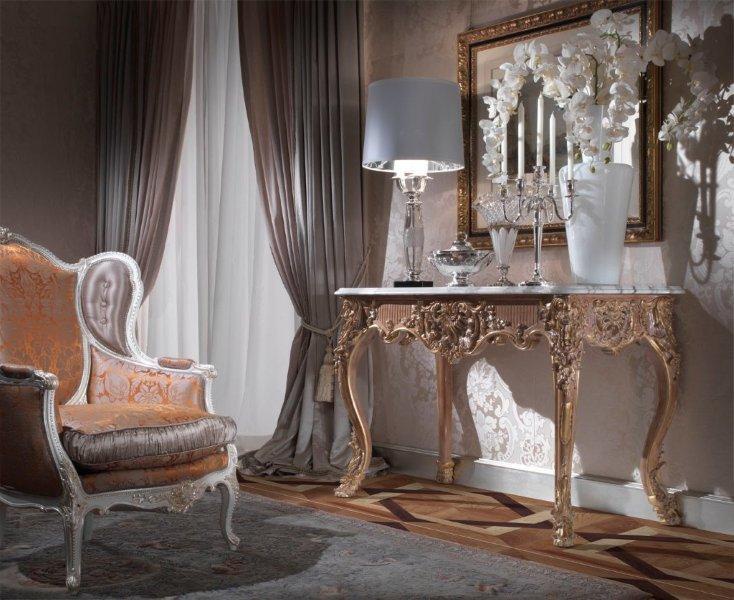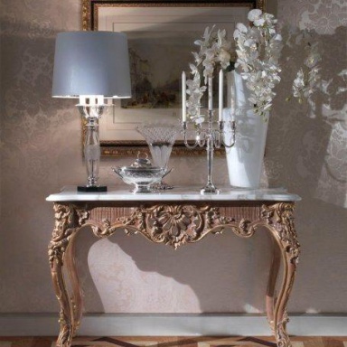 Console from the Italian producer Armando Rho. Elegant legs made from solid wood. Top in rectangular shape is made of marble. Option finishes in the catalog of the company. Decoration is the decorative carving handmade.