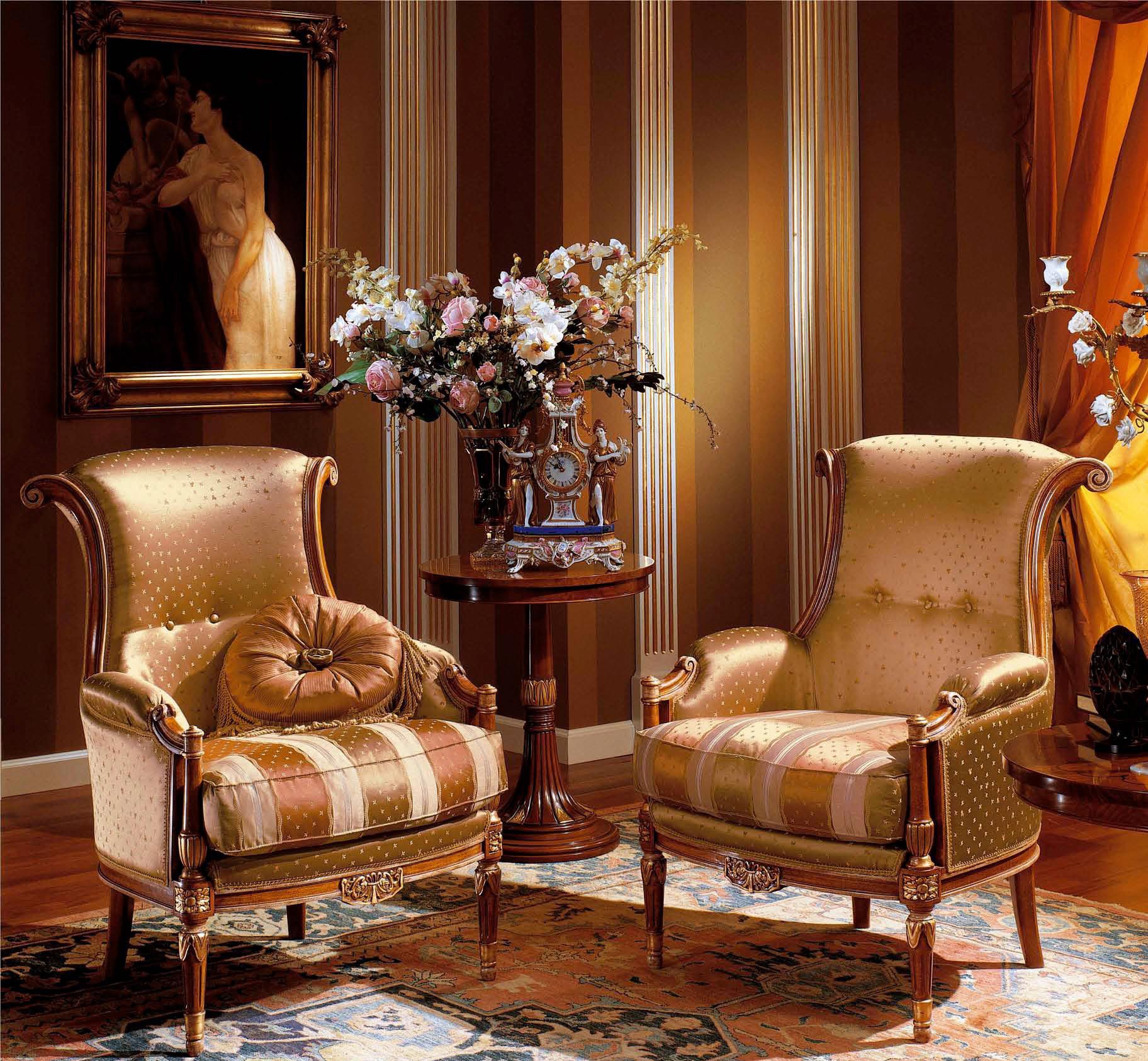 frame: solid wood upholstery: textiles filler: polyurethane foam (SPF) filler: Pooh the surface: lacquered carved elements: handmade carved elements: gilding |