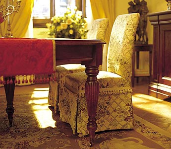 Chair with soft back from the Italian manufacturer DOLFI. The frame is made from solid wood, upholstery - textiles from a range of campaigns. Model with high back for dining room designed in classic style. Colours in stock.