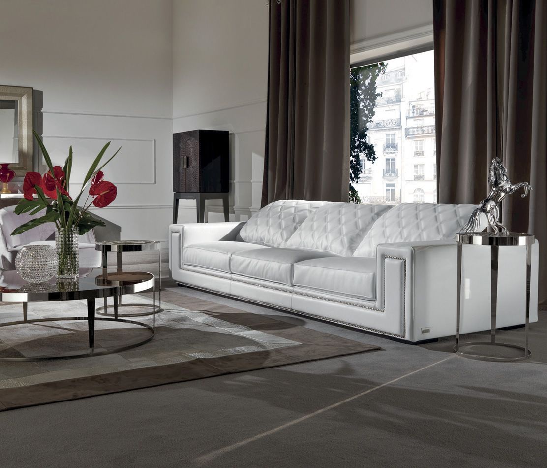 Helmut sofa from Italian manufacturer Longhi. Model with a hidden frame. Elasticity design attached elastic straps. The seat cushion and backrest are filled with foam and goose down. Leather or textile upholstery is not removable.