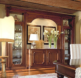 A display Cabinet from the Italian manufacturer DOLFI. The frame is made from solid wood. Model with space for storage of utensils, TV and books. Cabinet with built-in lighting. A good choice for a library or living room in classic style. Available color dark.