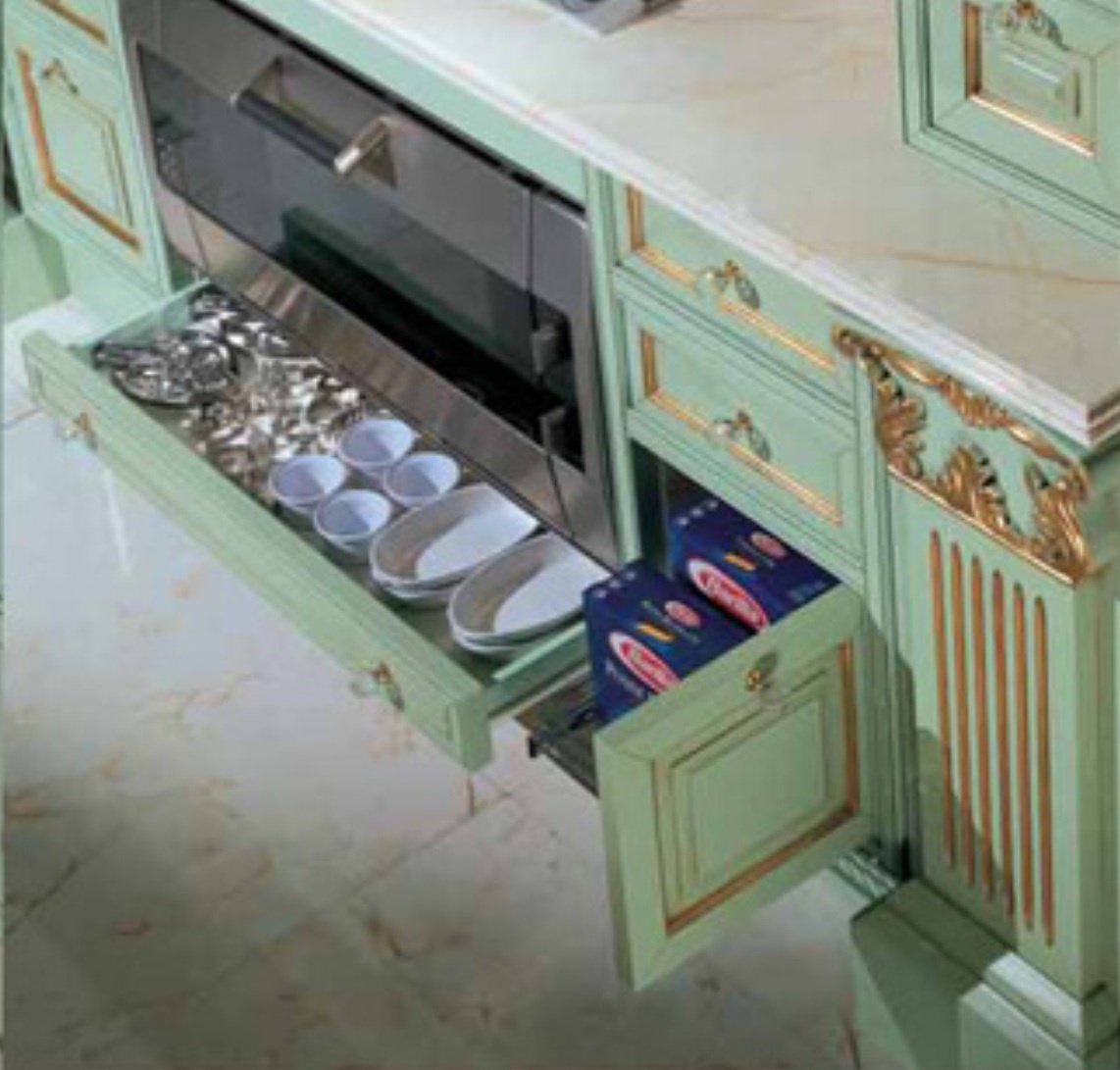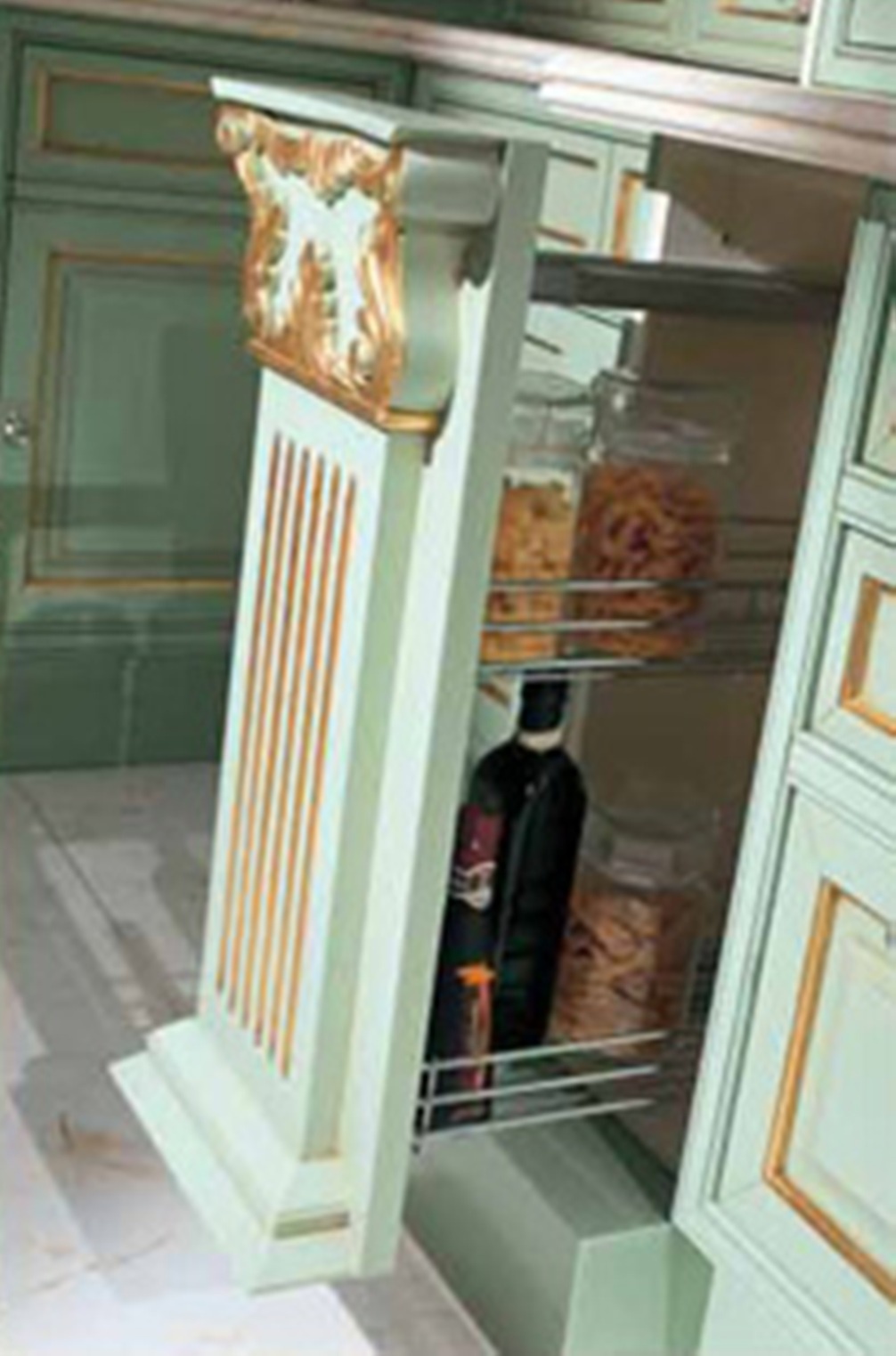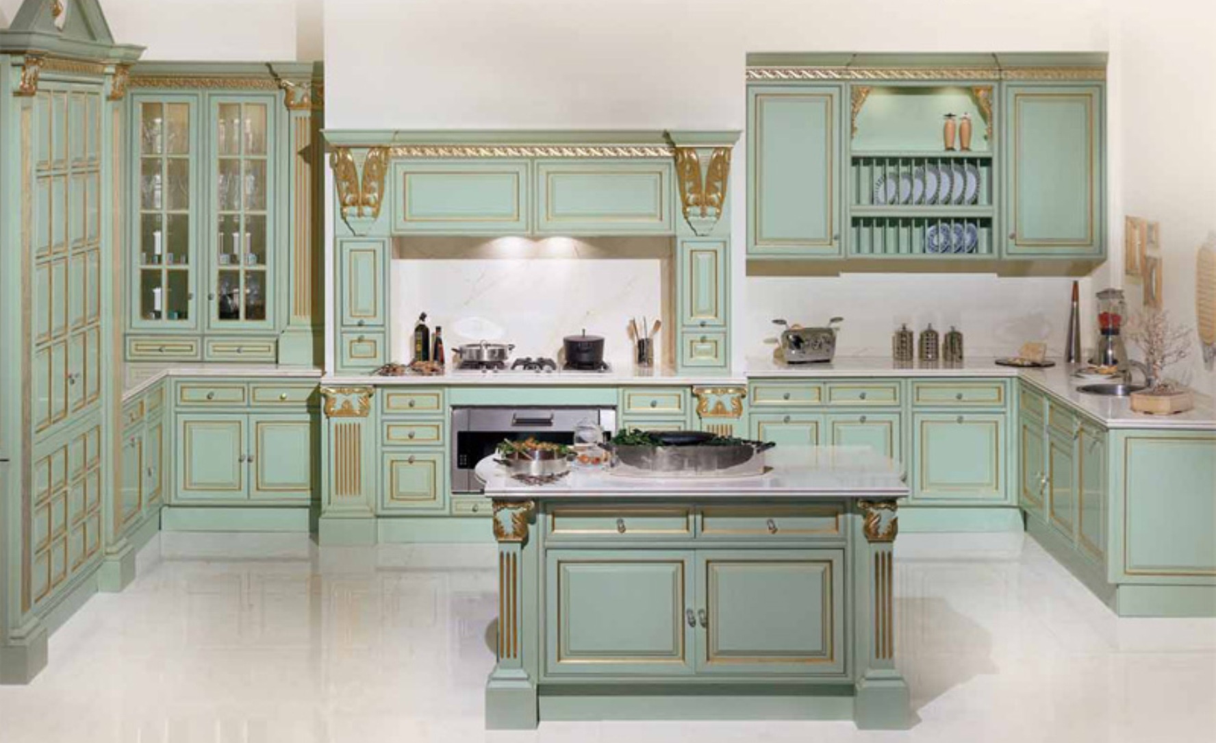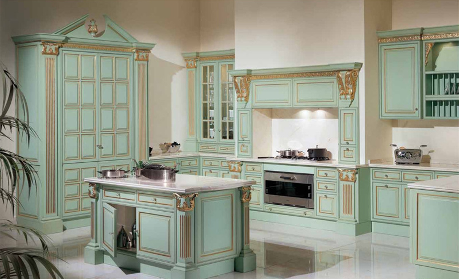 Set for the kitchen Italian manufacturer Angelo Cappellini. Presents headsets for classic kitchens of wood. Color in white or blue tone with gold elements.