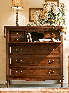 A chest of drawers from Italian manufacturer DOLFI. The frame is made from solid wood. Rests on carved feet. Decorative accessories - metal. Model with drawers of different depth and size. A great choice for the living room in a classic style. Product color dark.