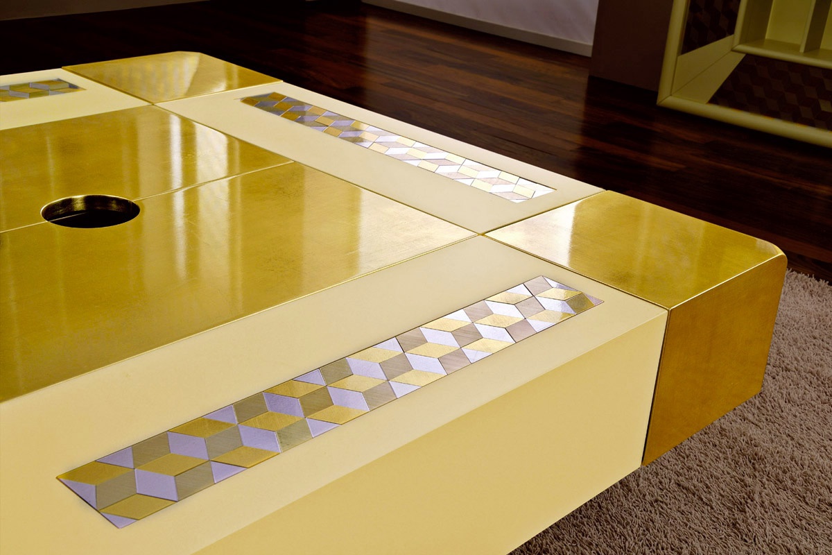 Coffee table rectangular Ciaika 170 Italian manufacturer Vismara. Table is equipped with lockers for storing SD and mini bar. A table decorated in yellow, white and Golden tones. Perfectly fits in a modern interior living room.