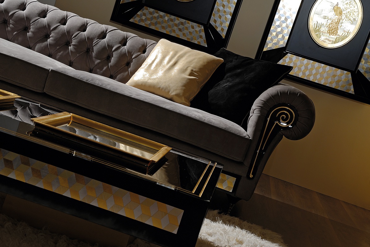 Sofa double Chest Nouveau Italian manufacturer Vismara. Sofa on a wooden frame. With grey textile, trimmed with stitch Capito. Model for small feet. Decorated with silver panels. The perfect solution for modern interior living room.