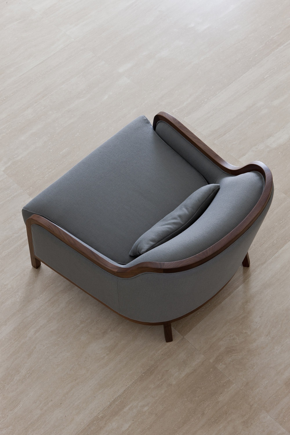 A chair made from walnut wood Charlotte from the Italian manufacturer Porada. Upholstered in textile or leather from the company portfolio. The frame is decorated with carved elements. The filler is not deformable polyurethane foam. Colours in stock. The chair will perfectly complement the modern interior.