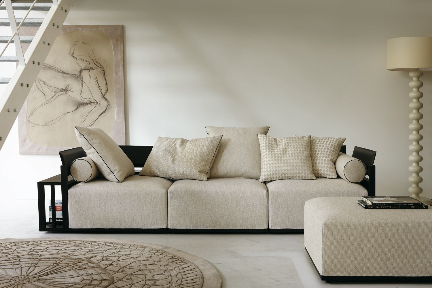 Bolero modular sofa from Italian manufacturer Porada. Model with a frame made of walnut wood with removable cushions. Cushion upholstered in fabric or leather. Upholstery made of cotton, leather, polyester or mixture - are the most common, they are durable and easy to wash. The polyurethane foam filler, in combination with down provides a more comfortable cushioning. The modern design. Colours in stock.