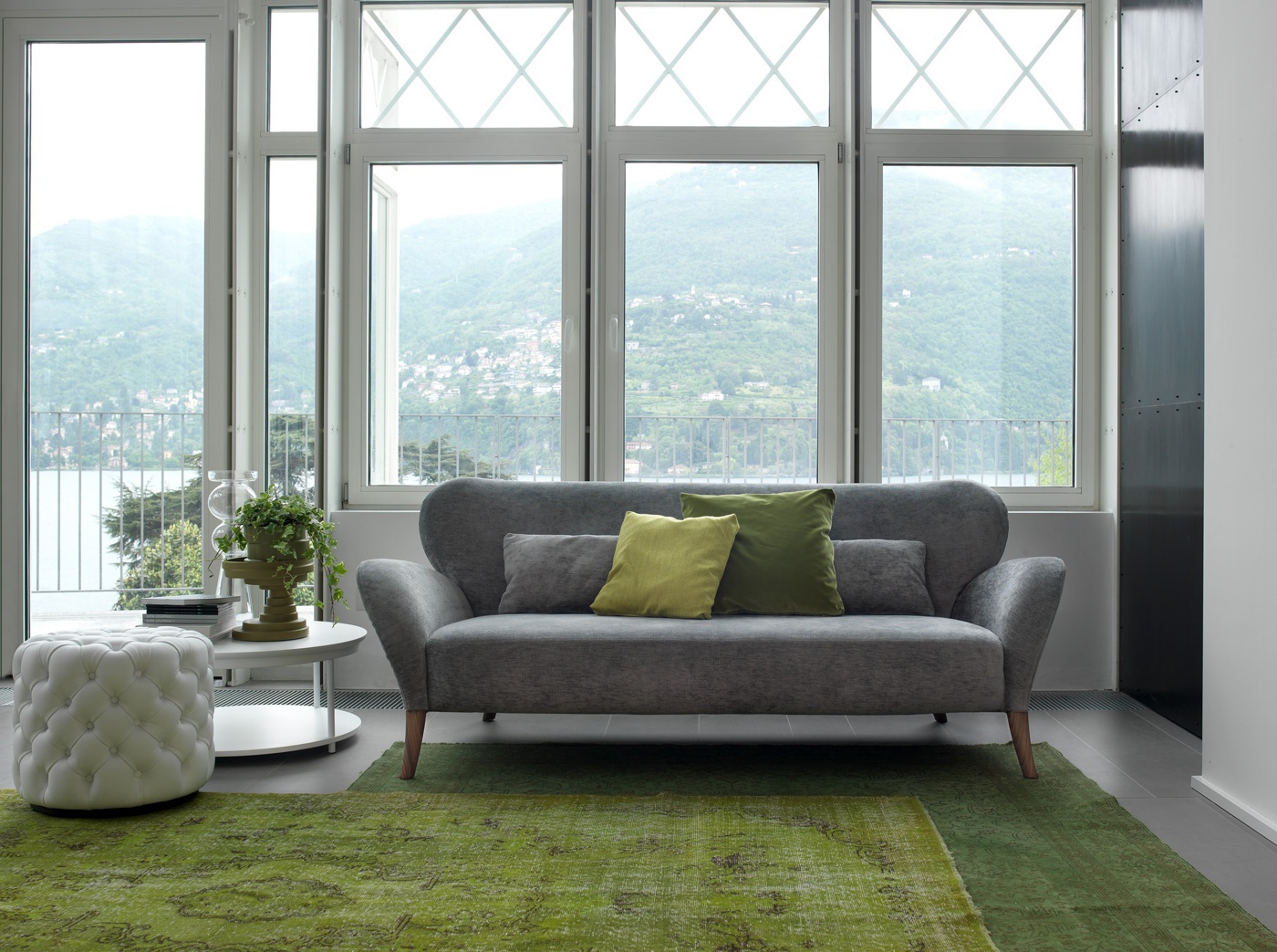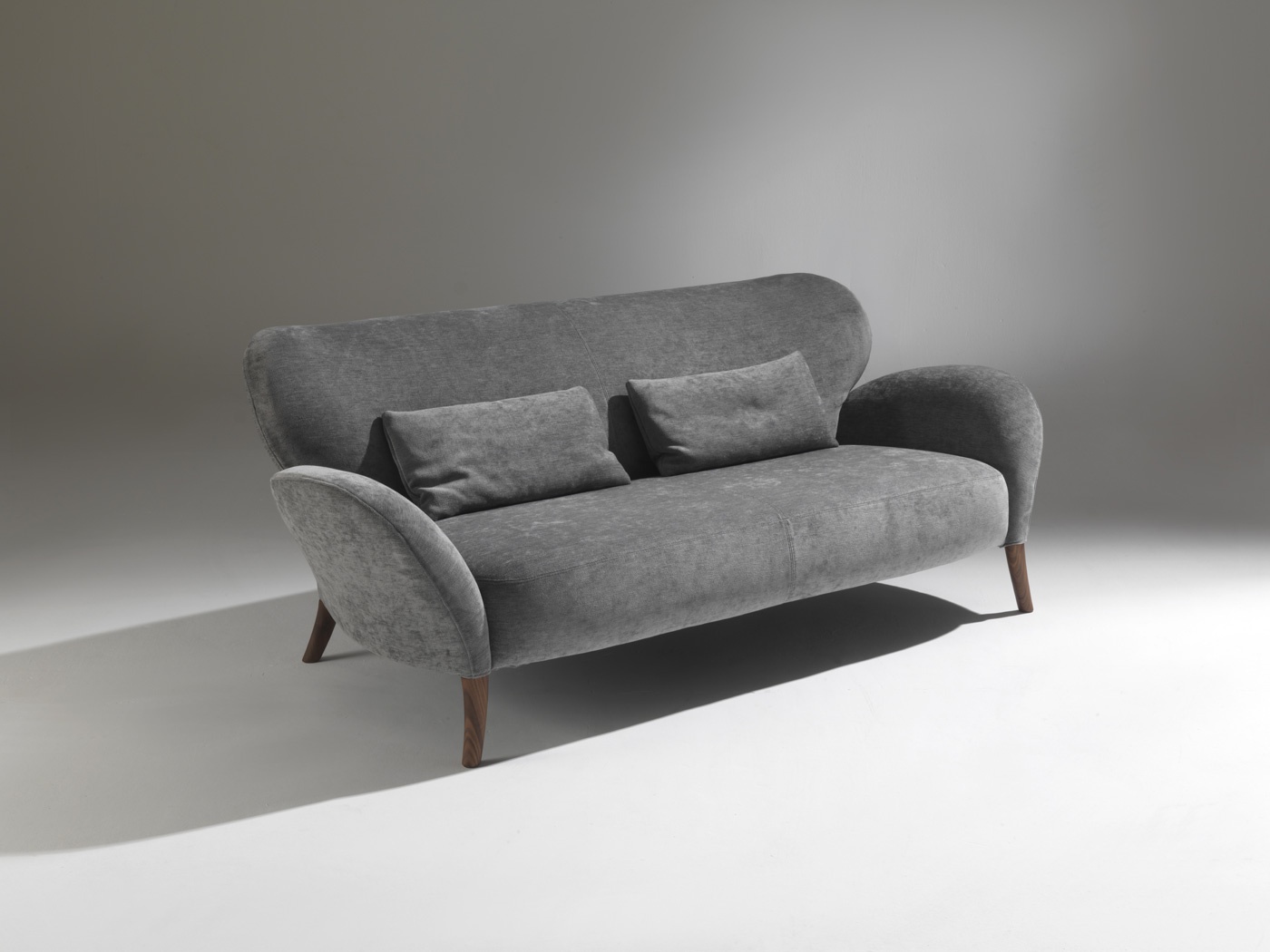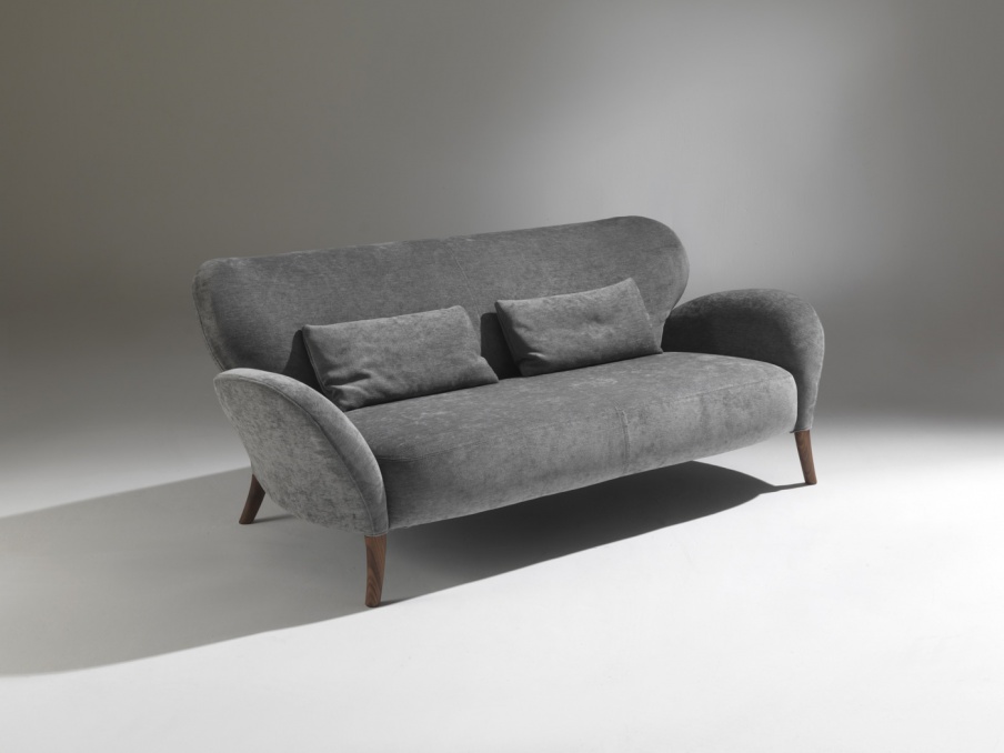 Cloud two-seater sofa from Italian manufacturer Porada. Strict sofa on a frame of solid wood with legs in walnut veneer. Upholstery textiles or leather. Affordable upholstery material from the customer. The polyurethane foam filler, in combination with down provides a more comfortable cushioning. The modern design. Colours in stock.