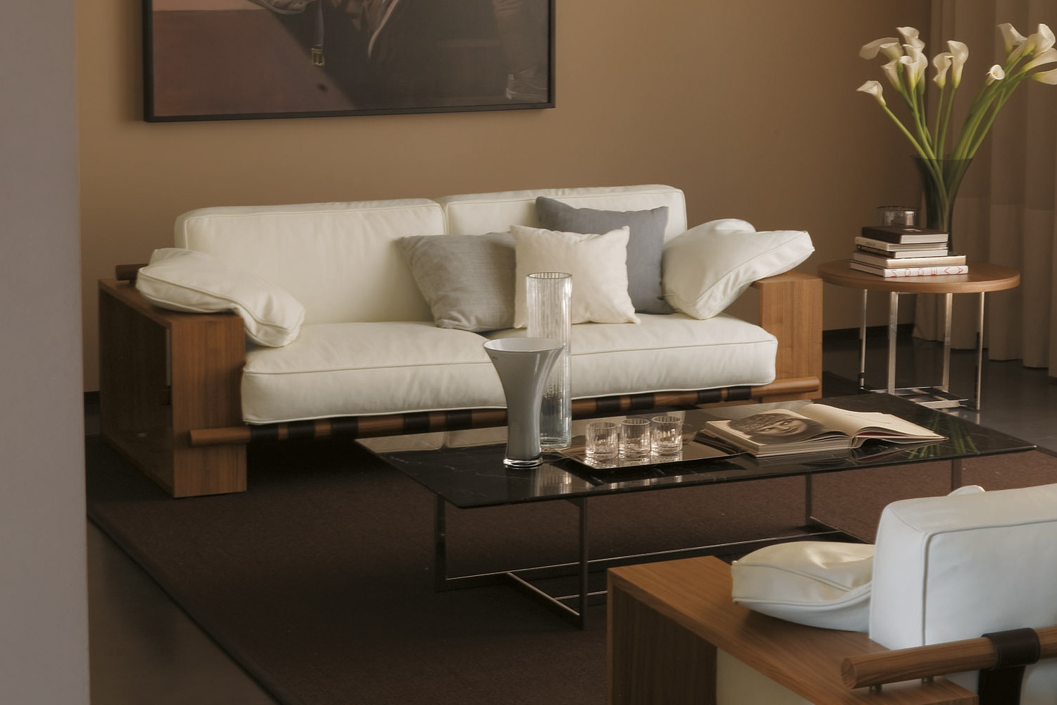 The Panama sofa double sofa from Italian manufacturer Porada. Model with wide armrests. The frame and legs are made of solid walnut Noce Canaletto. Finish offered a choice from the collection of the company. Seat and back upholstered in fabrics or leather. Colors to choose from the collection of the factory. The filler is not deformable polyurethane foam and fluff. Complement the design of decorative pillows.