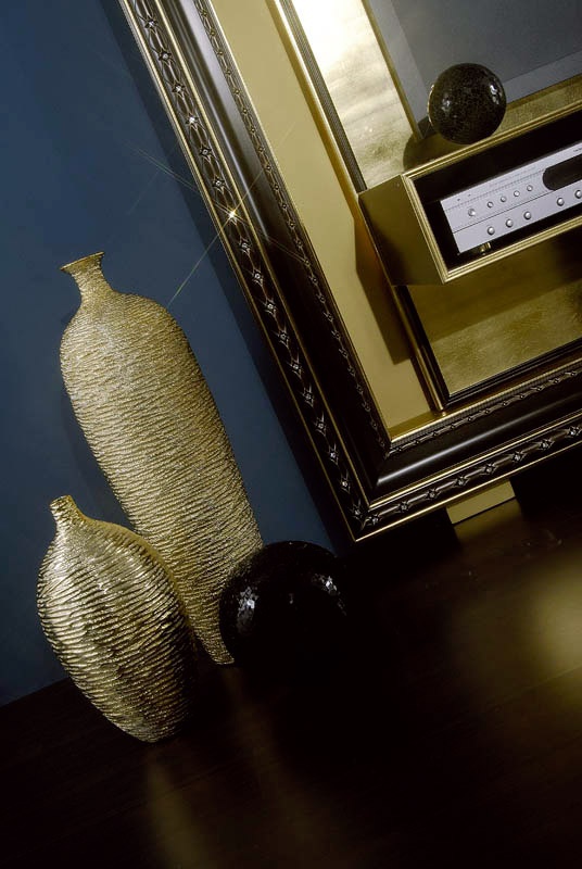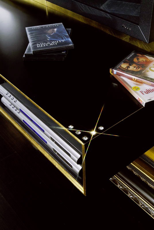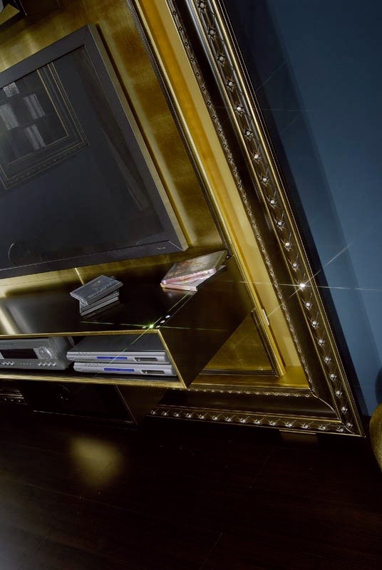 The panel under the TV and The Home Cinema Frame the Italian manufacturer Vismara. The panel is of rectangular shape in the frame. The furniture is equipped with shelves and drawers to install a home theater. Color dark brown with gold accents. a modern interpretation of the classic style