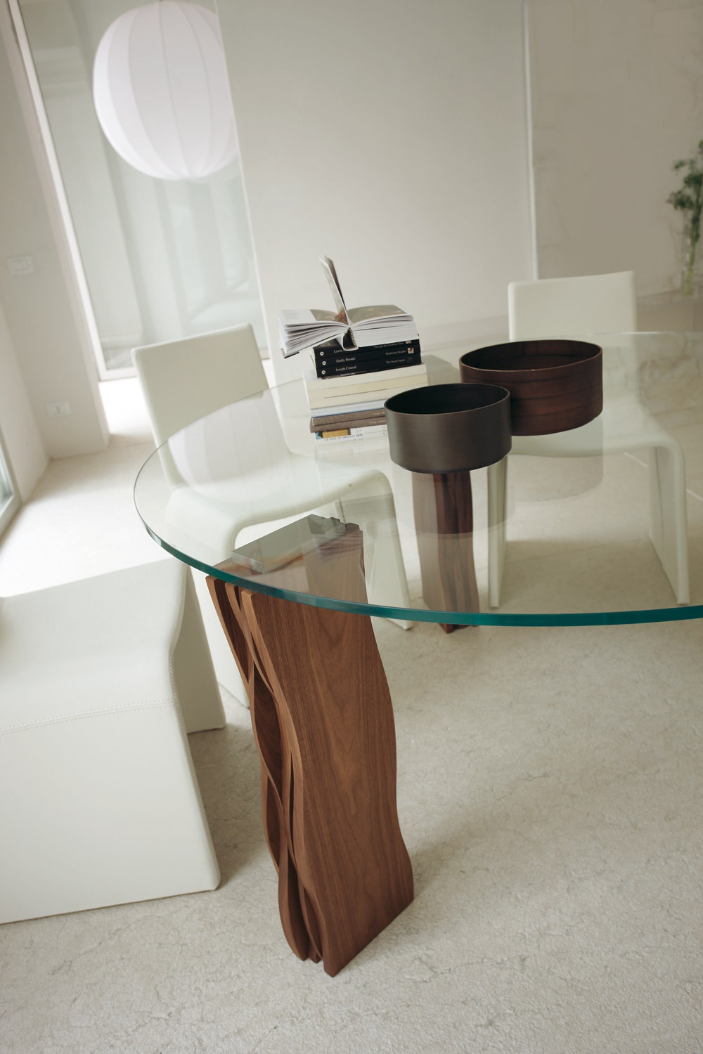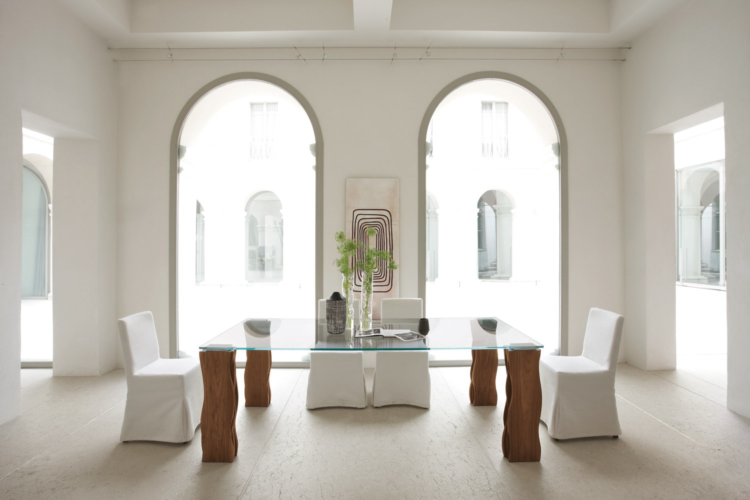 The Samburu dining table by Italian manufacturer Porada. The tabletop is made of tempered glass. Model round, square or rectangular shape. Legs are made of carved walnut wood. The original solution that will help to optimize the available space and provide comfort. The modern style of execution.