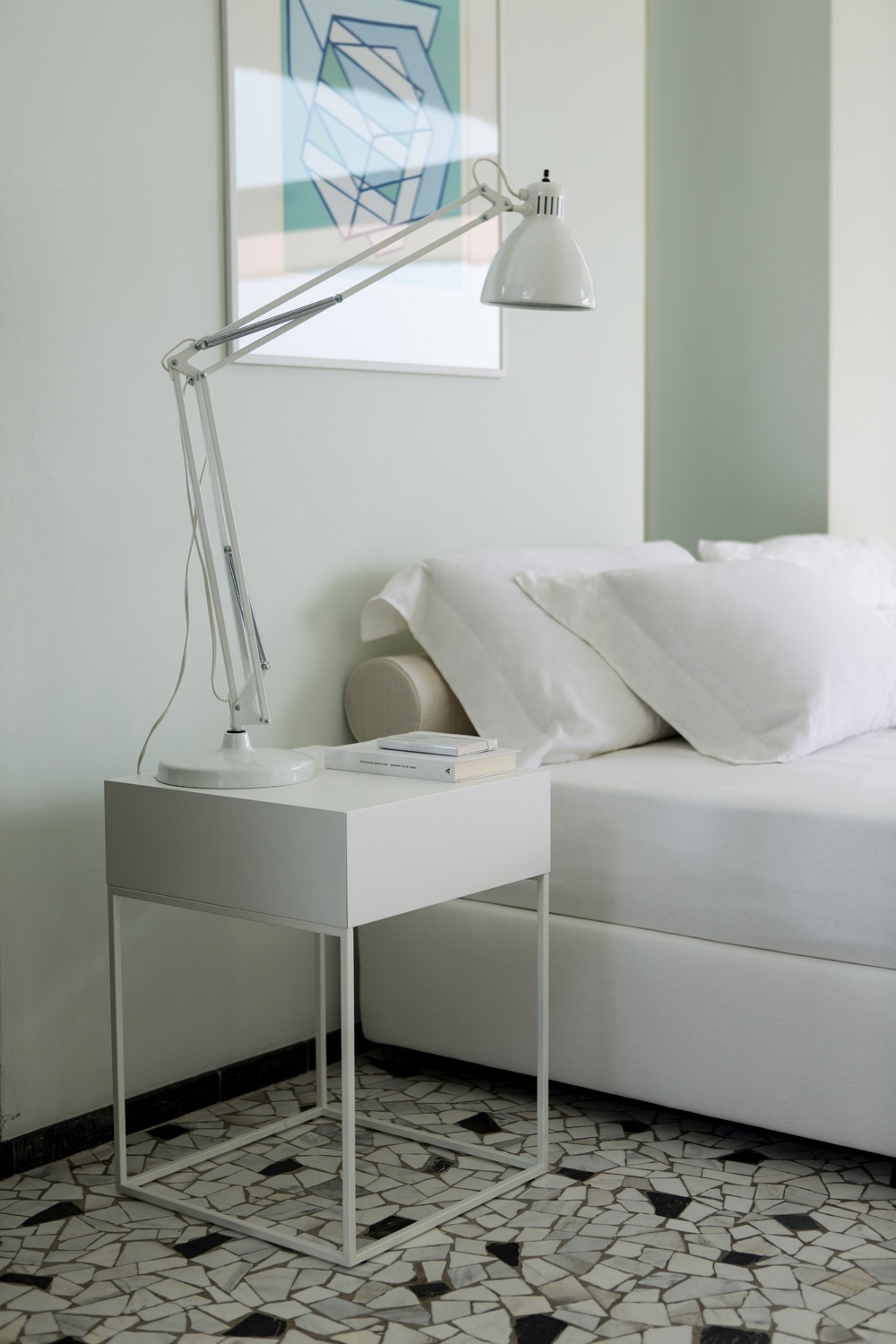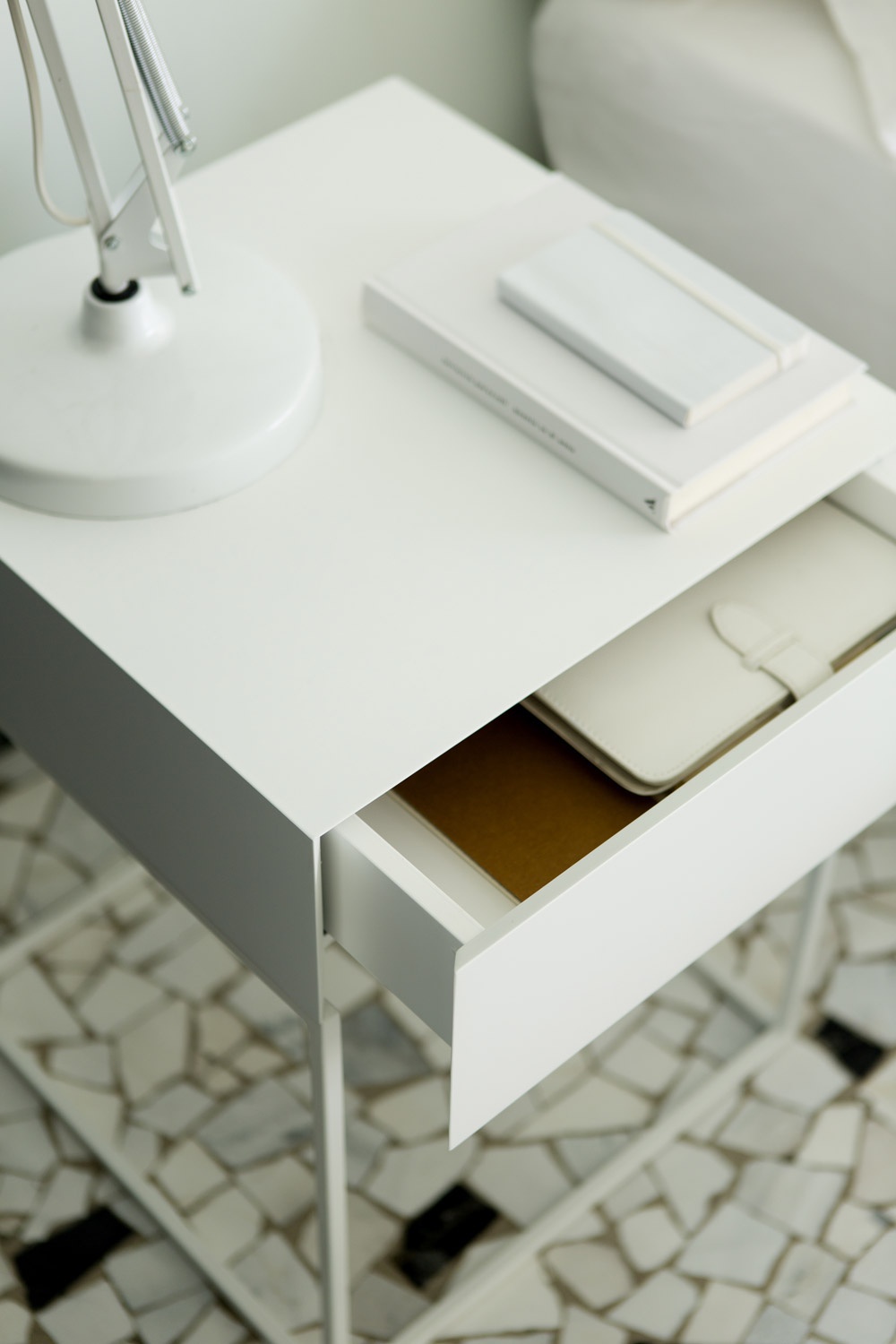 | Description: | Table with frame made of metal in white lacquer, and drawer 45°in a white Matt lacquer finish with closed pores. (As pictured) |