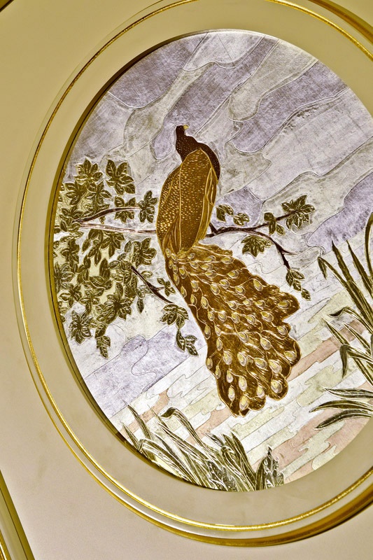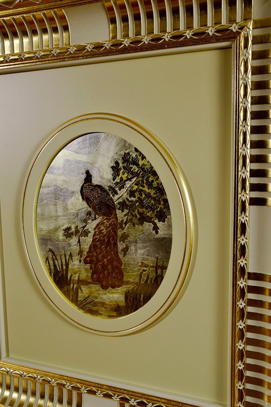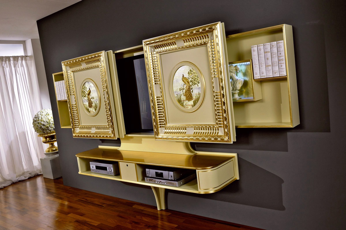 The panel under the TV Sliding Home Cinema Italian manufacturer Vismara. The furniture installation for home theater. Model with slidding doors. The doors are decorated with two peacocks. The color of the furniture gold.