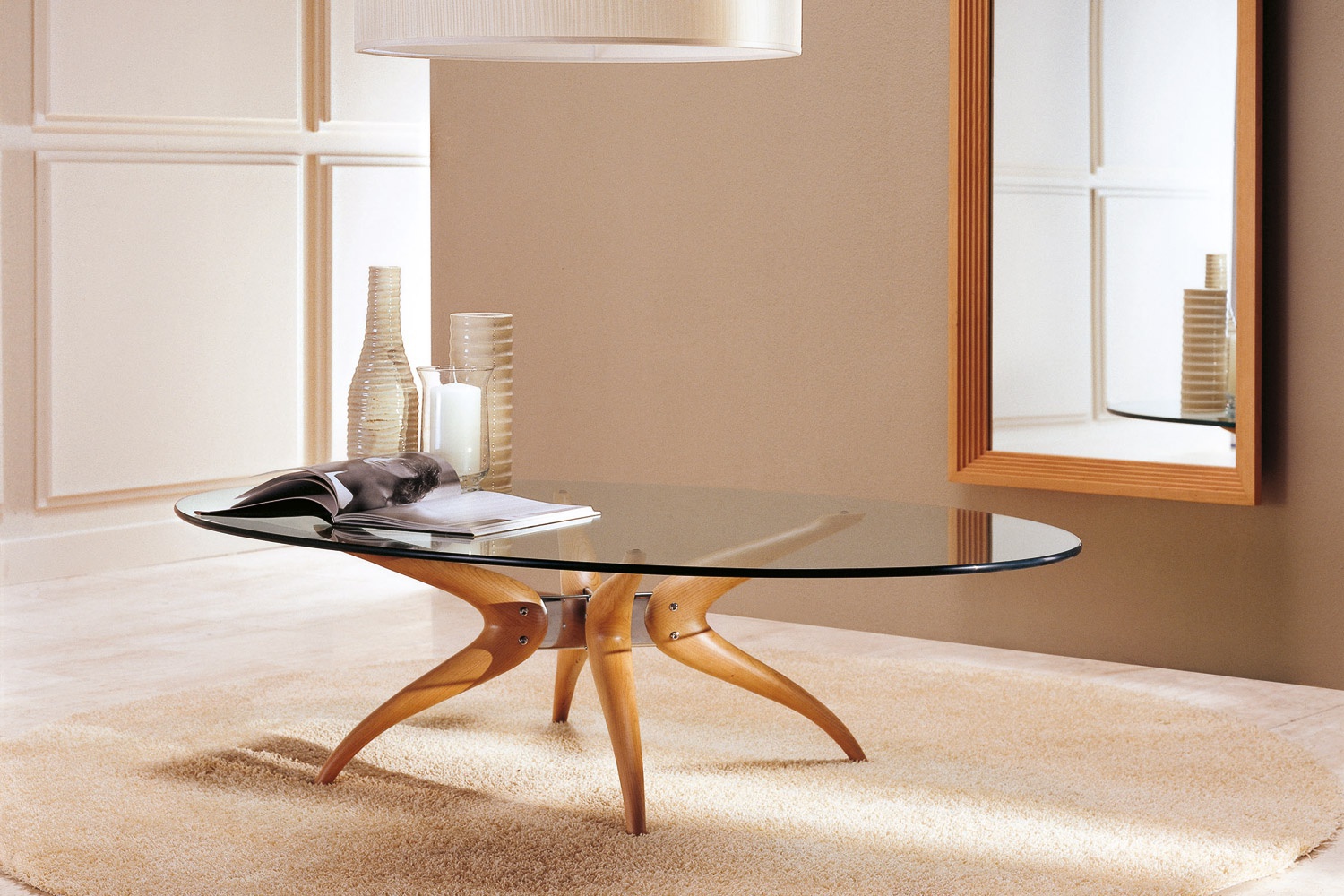 Denuo coffee table with glass top by Italian manufacturer Porada. The model is made with legs made of cherry tree. Finish in color of natural wood, stained or lacquered finish. Color in stock. The style is modern.