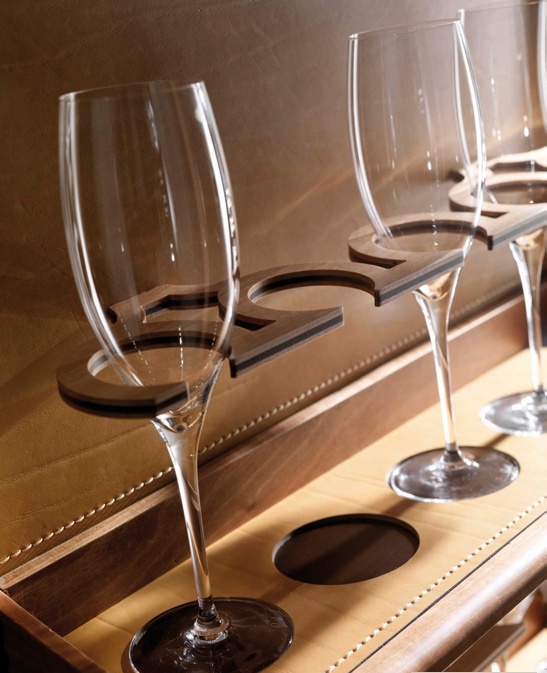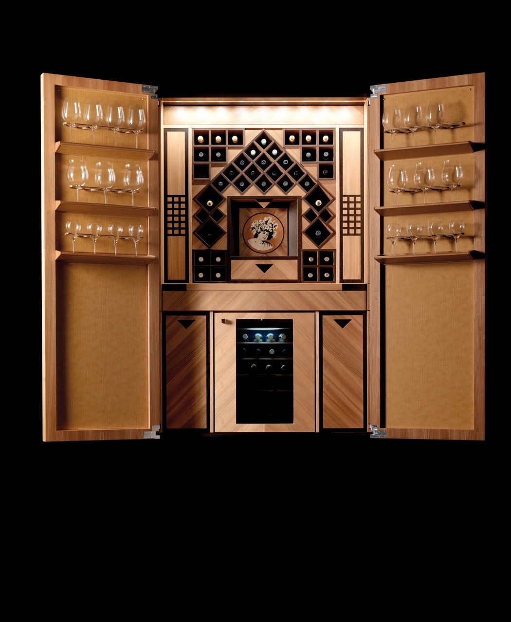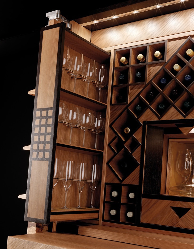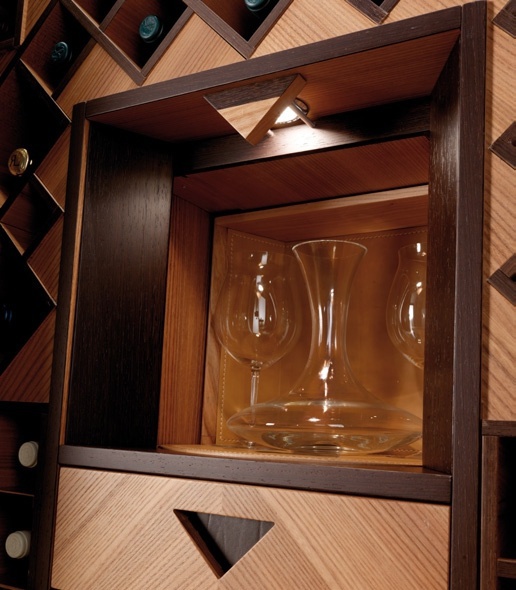 Wine Cabinet Vino Colonna with double doors from the Italian manufacturer Toncelli. The Cabinet is made of solid wood. Finish - veneer. Doors, shelves and drawers decorated leather. Provided holders for wine glasses and an special wine fridge for up to 36 bottles. Available as a limited edition.