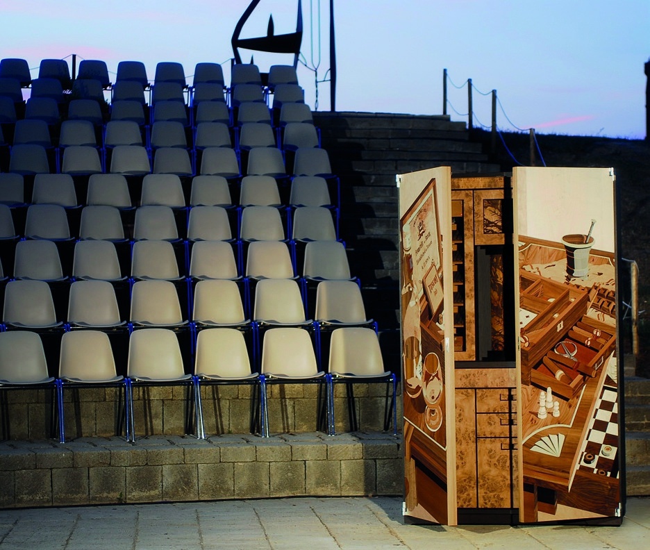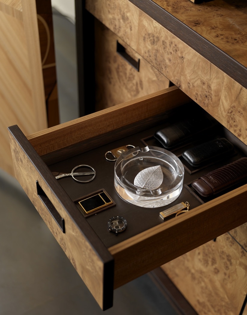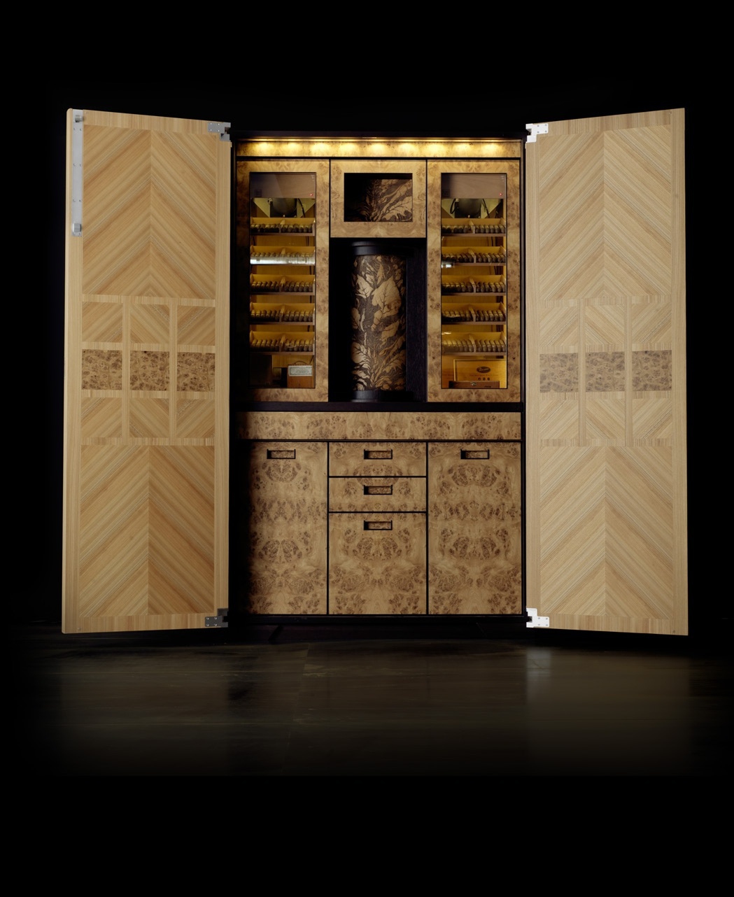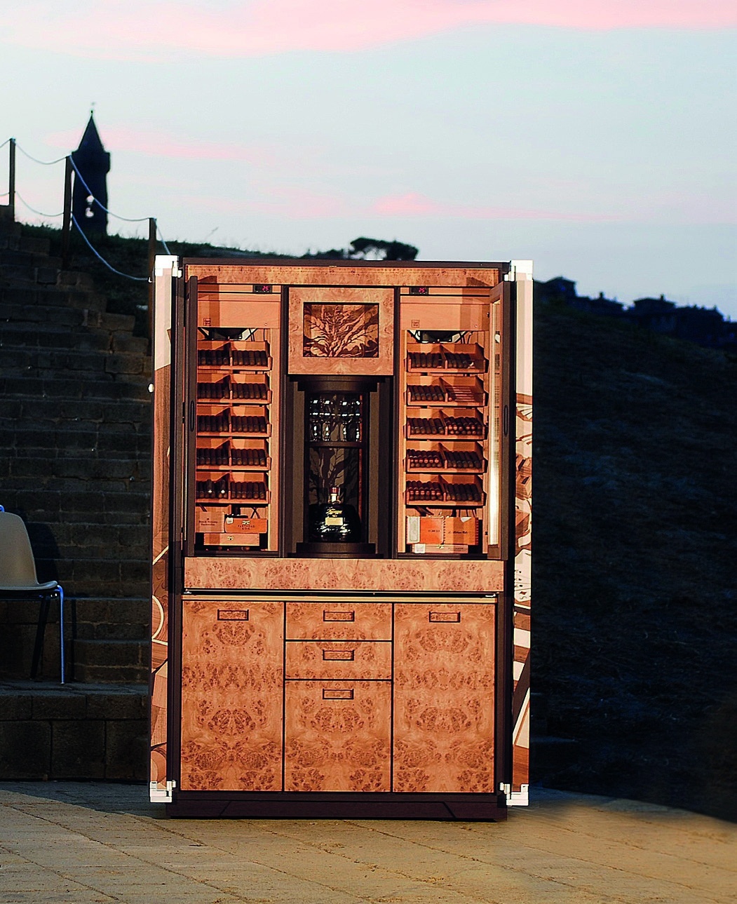 Cabinet for cigars Sigari Colonna from the Italian manufacturer Toncelli. A model with swing doors. Housing of solid beech. Storage compartments for cigars with Spanish cedar. Finish to be selected from a catalog company. The kit includes glasses, two fridges for storage of cigars, trays, ashtrays and scissors.