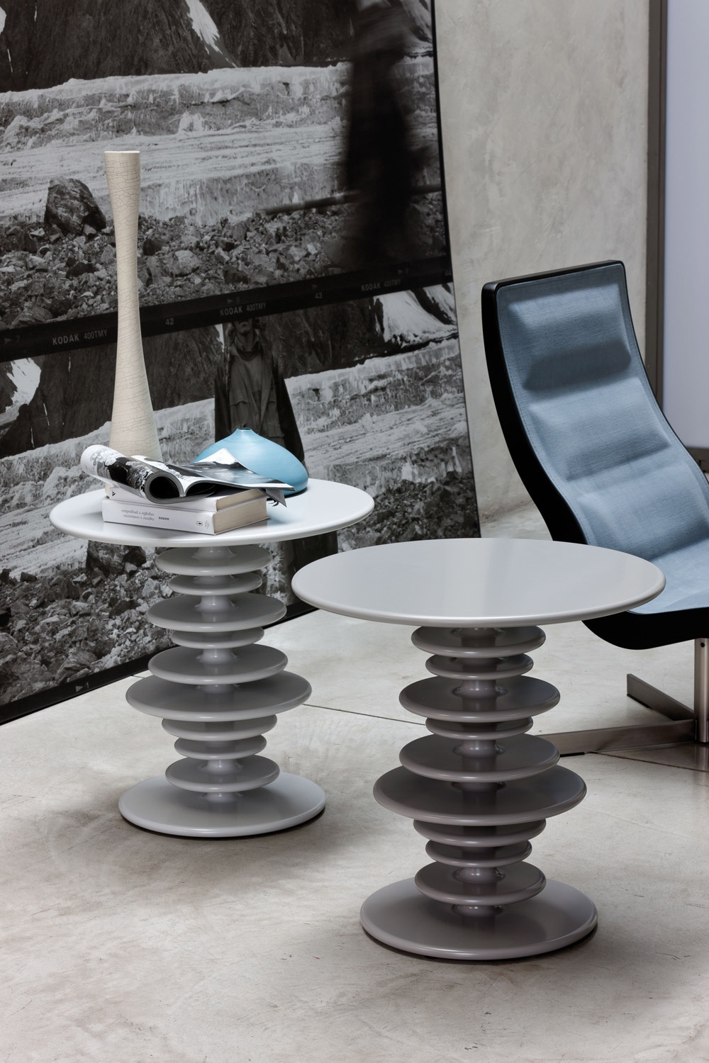 Fluid coffee table by Italian manufacturer Porada. Model with a round top. Made of wood with lacquered surface. The modern design. Colours in stock.