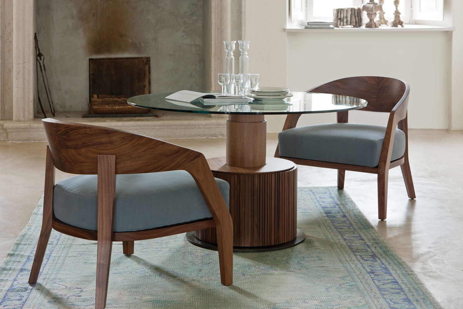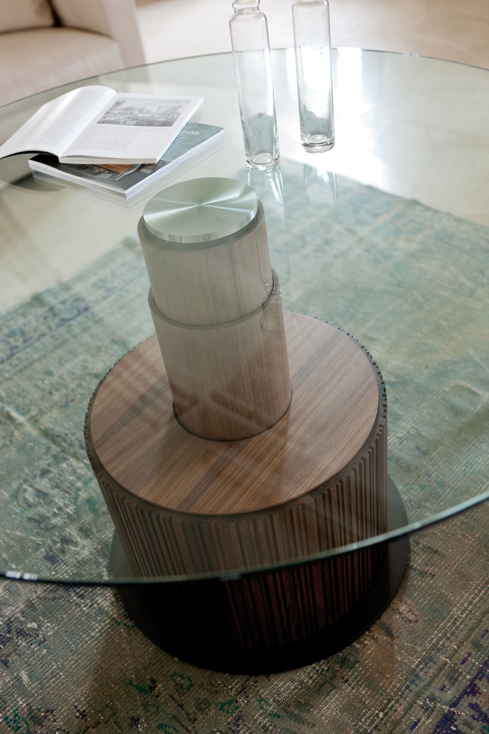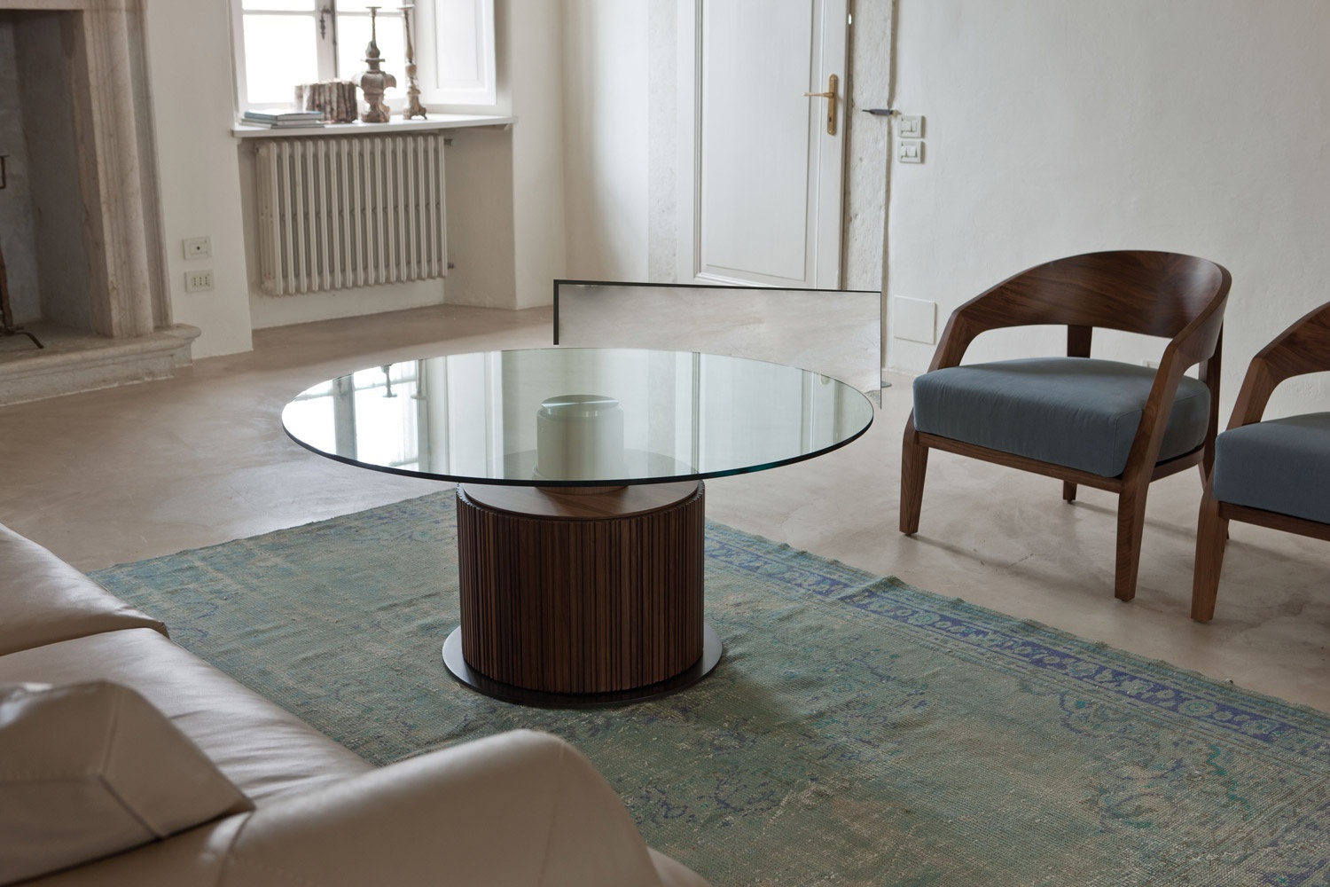 Lift coffee table by Italian manufacturer Porada. The model with the lift of steel with electrical power. The height can be set with a remote control. The base table with frame in walnut. Top of tempered glass. The model is made in modern style. Colours in stock.