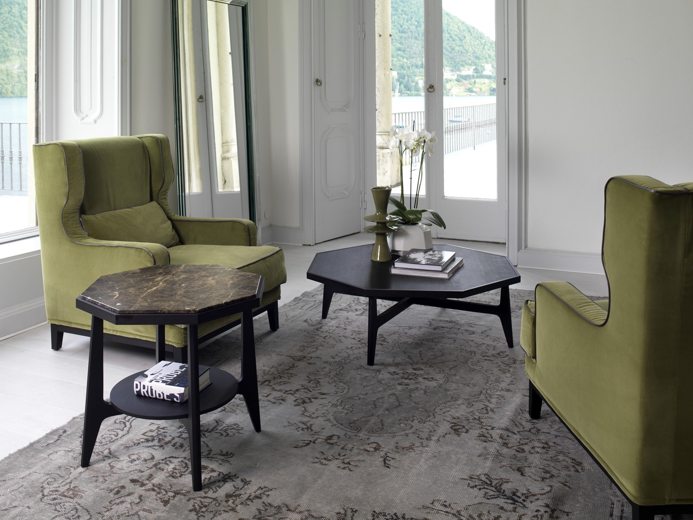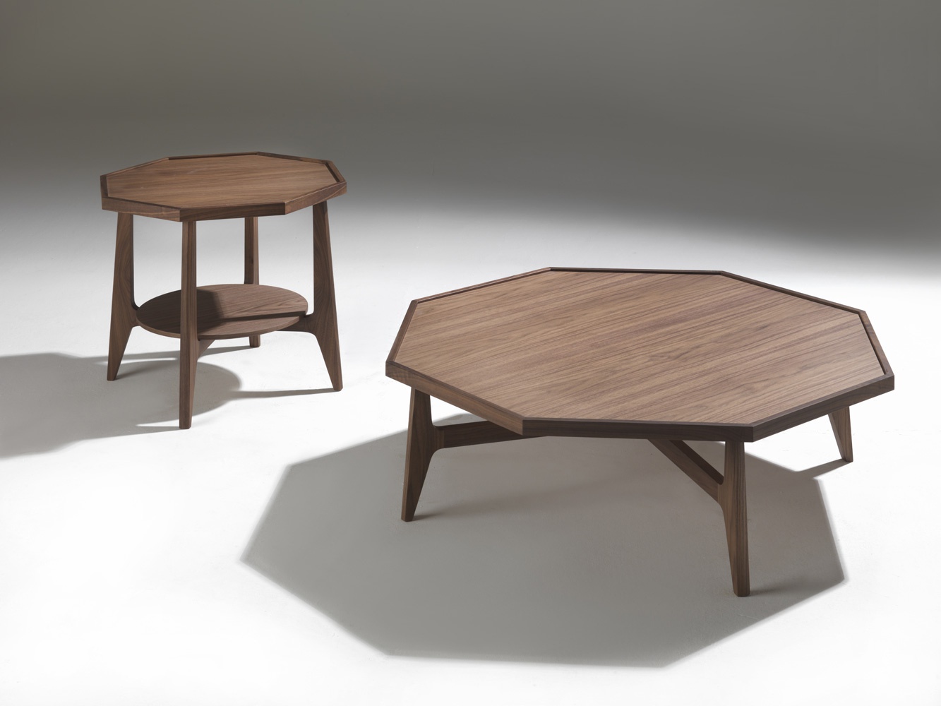 Marrakesh coffee table made of ash tree from the Italian manufacturer Porada. Modern design work. Model with a high or a low coffee table made of solid ash wood stained oak, wenge, walnut, or painting. The top is made of wood or marble. Colours in stock.