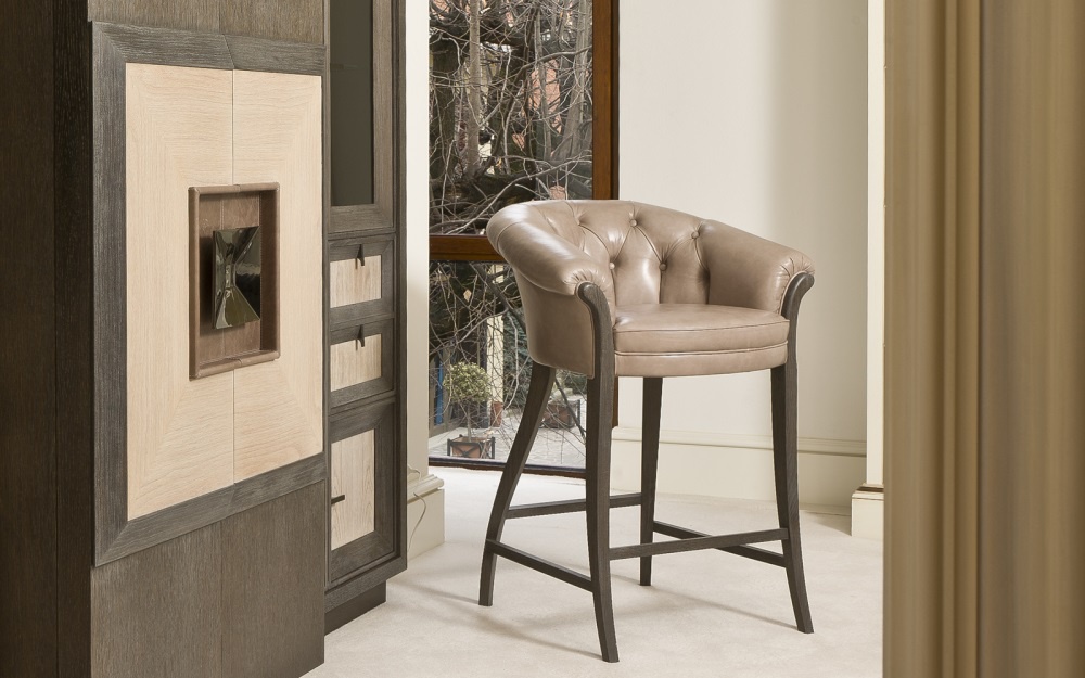 Bar stool from the Italian manufacturer Annibale Colombo. Model with a rounded back and armrests. Material - solid wood. The upholstery is leather or textile. Colors in the catalog of the company. Features give high legs.
