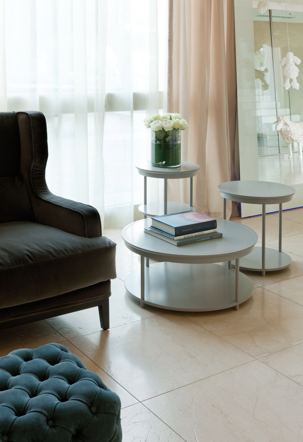 Plateau coffee table made of wood from the Italian manufacturer Porada. Model with a high or a low table of solid walnut, with round top. The finish offers a matte varnish. Available any size and finish options. The table is designed in modern style.