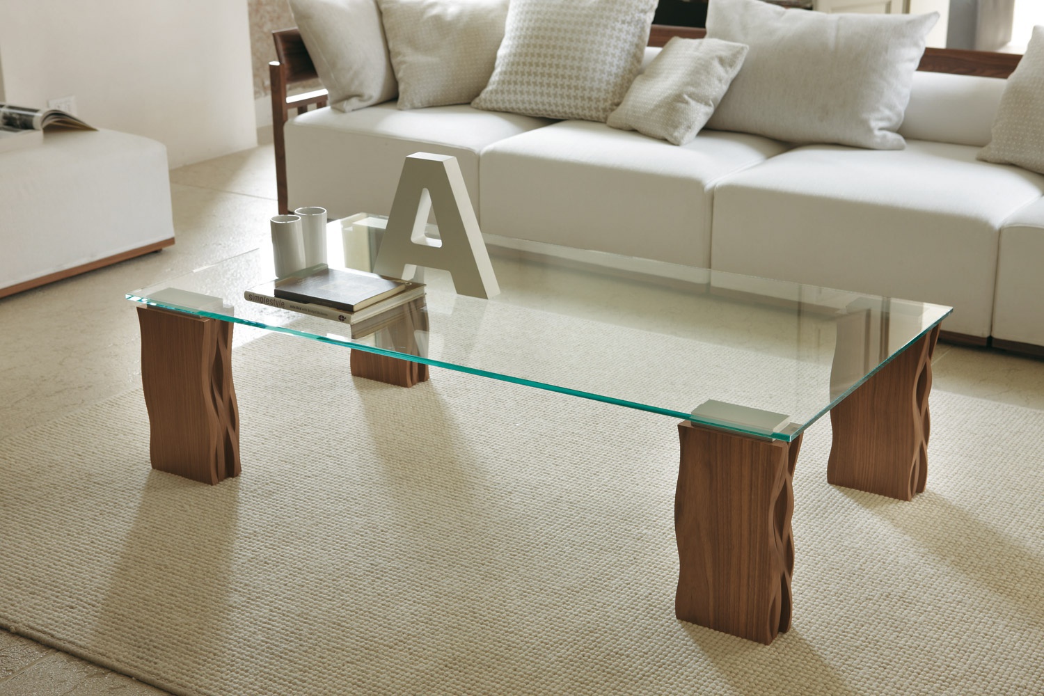 Pokot coffee table by Italian manufacturer Porada. Low table simple modern design. Top made of transparent glass. The legs are carved in walnut. Colors - in stock. Countertop rectangular, square or round. The model is made in modern style.