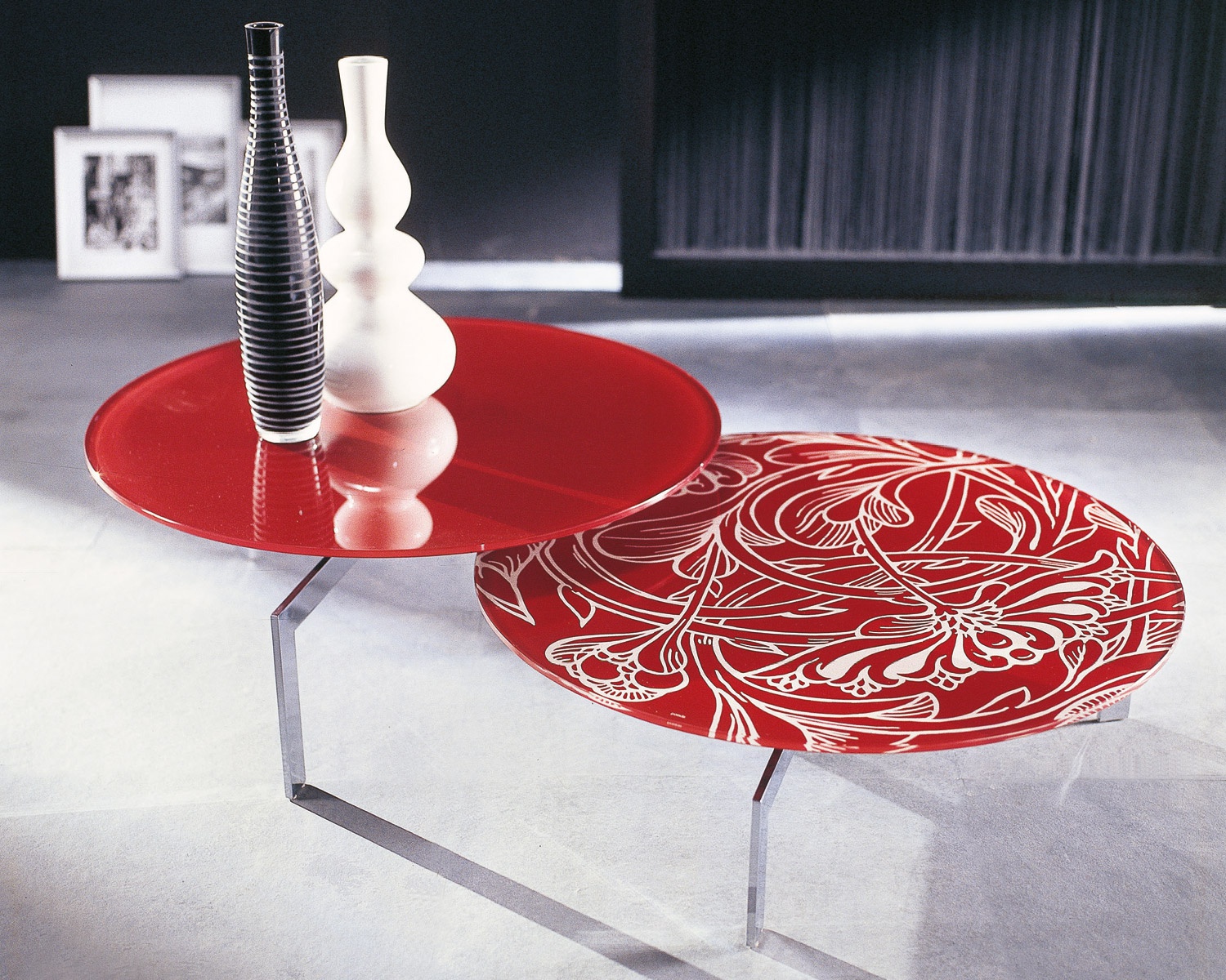 Coffee table with glass top Prado from Italian manufacturer Porada. Low table with frame of chromed steel. Countertop round colorful different colors and decorative patterns. Colors - in stock. The model is made in modern style.
