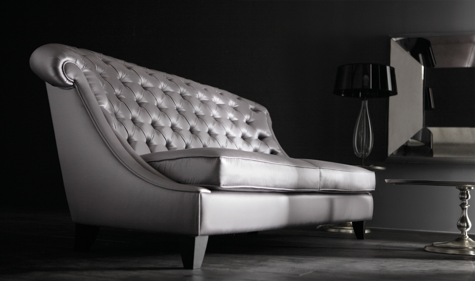 Magda sofa from Italian manufacturer Opera Contemporary. The model with high backrest and without armrests. The frame and legs are made of beech wood. The upholstery is made of leather or textile. The back is decorated with ornamental stitch-Capito. The model is made in art Deco style.