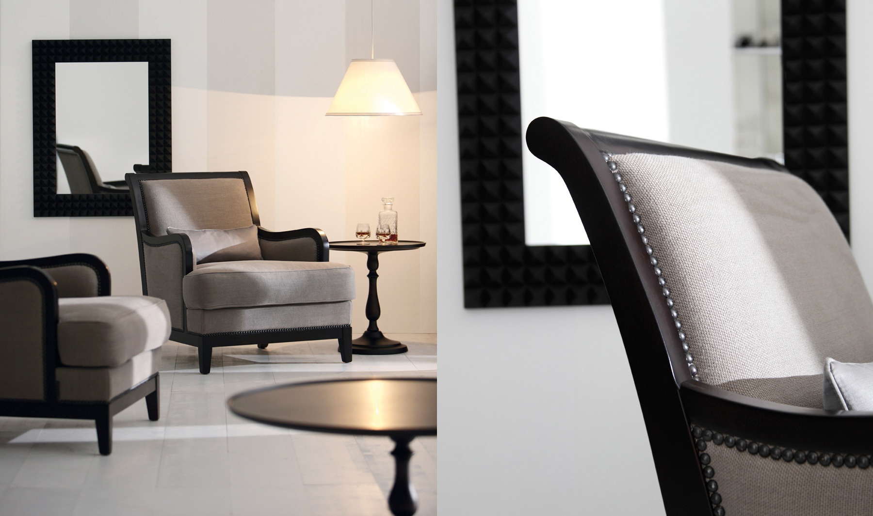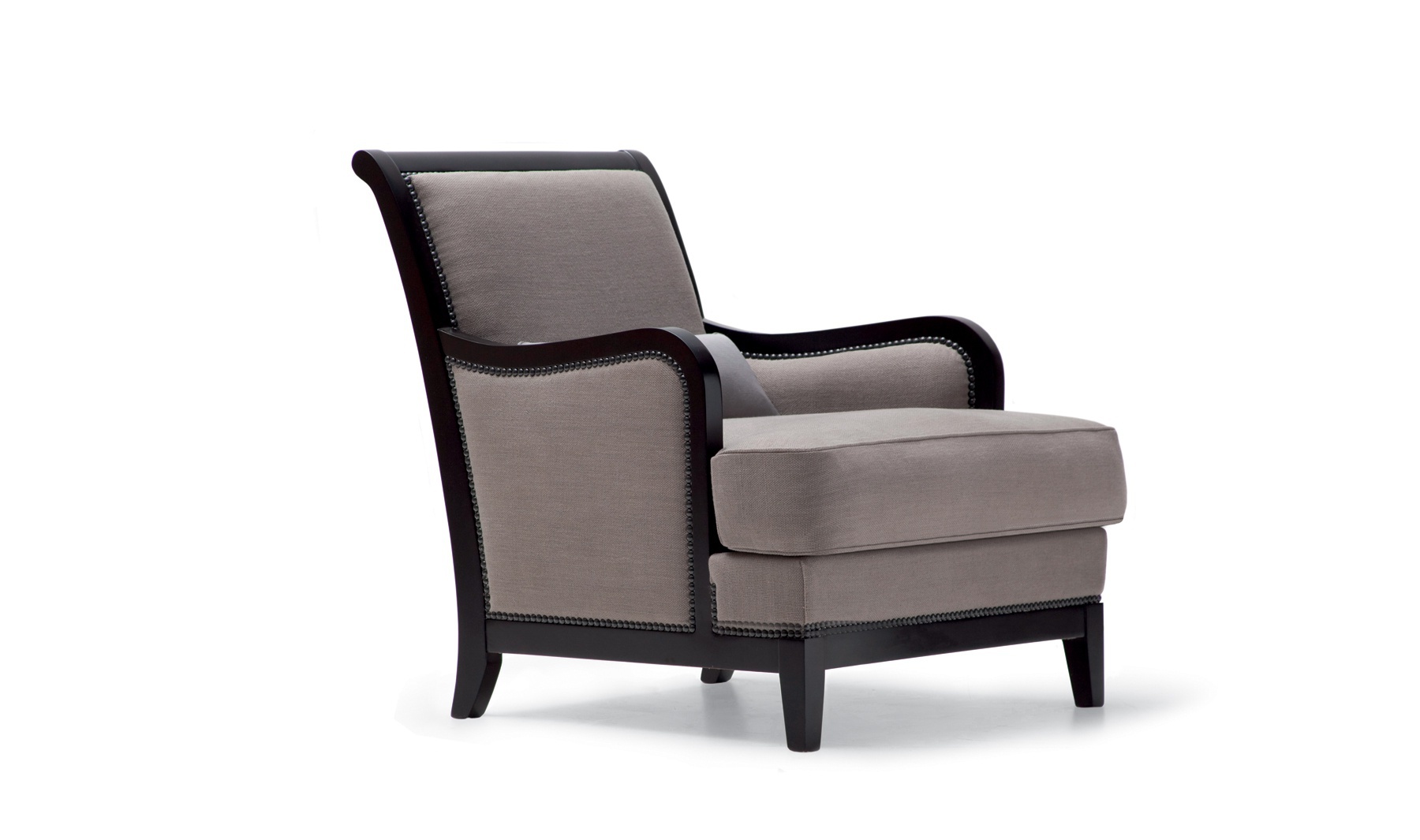 Sebastian armchair from Italian manufacturer Opera Contemporary. Model with a square back and wide seat. Seat on low legs made of solid wood.Upholstered in textile or leather according to the manufacturer's catalogue. The armrests and backrest okantovany wooden strip. Removable seat cushion filled with polyurethane foam.