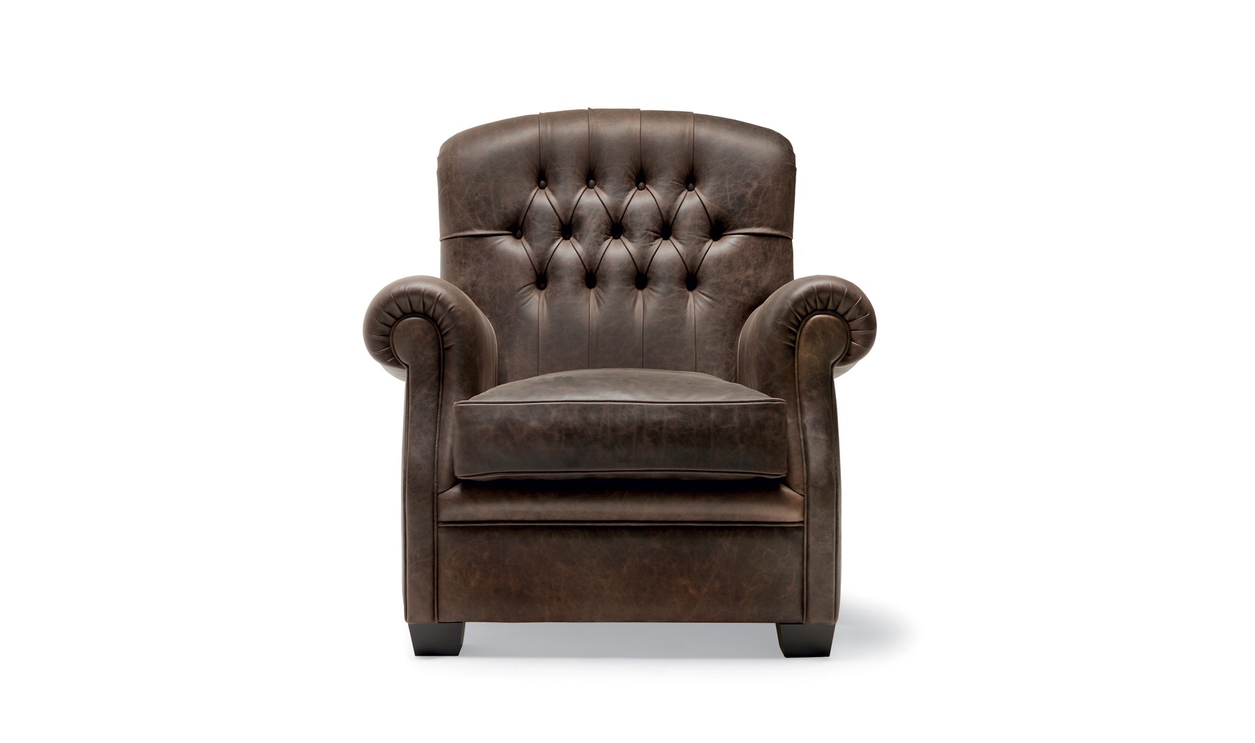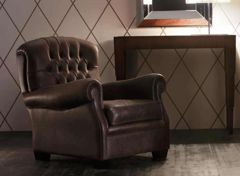 Loris armchair from Italian manufacturer Opera Contemporary. The model with a tufted back and a hidden frame is made in a classic style. Upholstery made of leather or textile in the catalog of the manufacturer. Seat cushion is removable. Legs weak, made of wood.