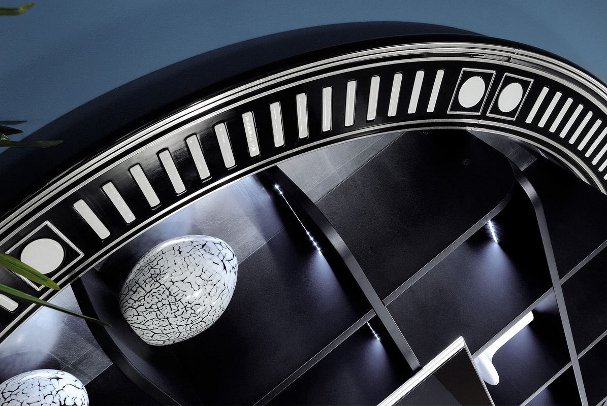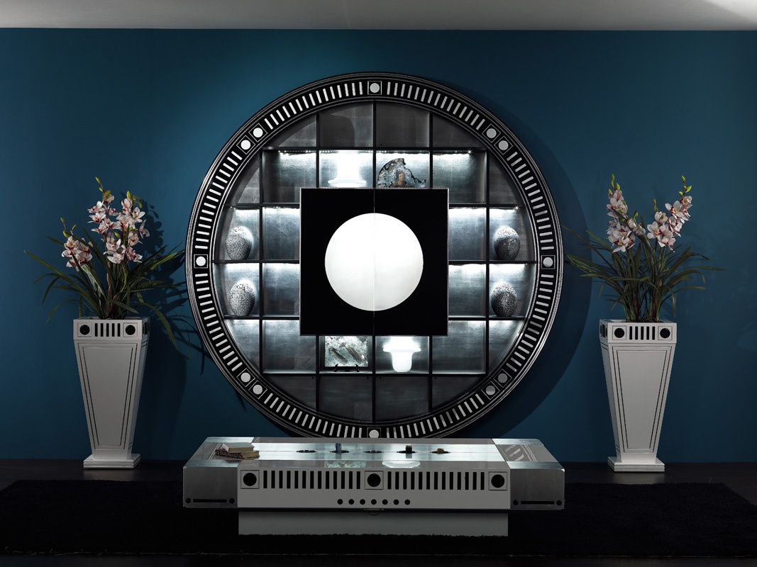 Star Gate wall bar Container Bar Italian manufacturer Vismara. The model wall round bar shape. The model is equipped with shelves with built-in neon lighting. Bar with sliding doors is located in the center. Color in silver tone with black.