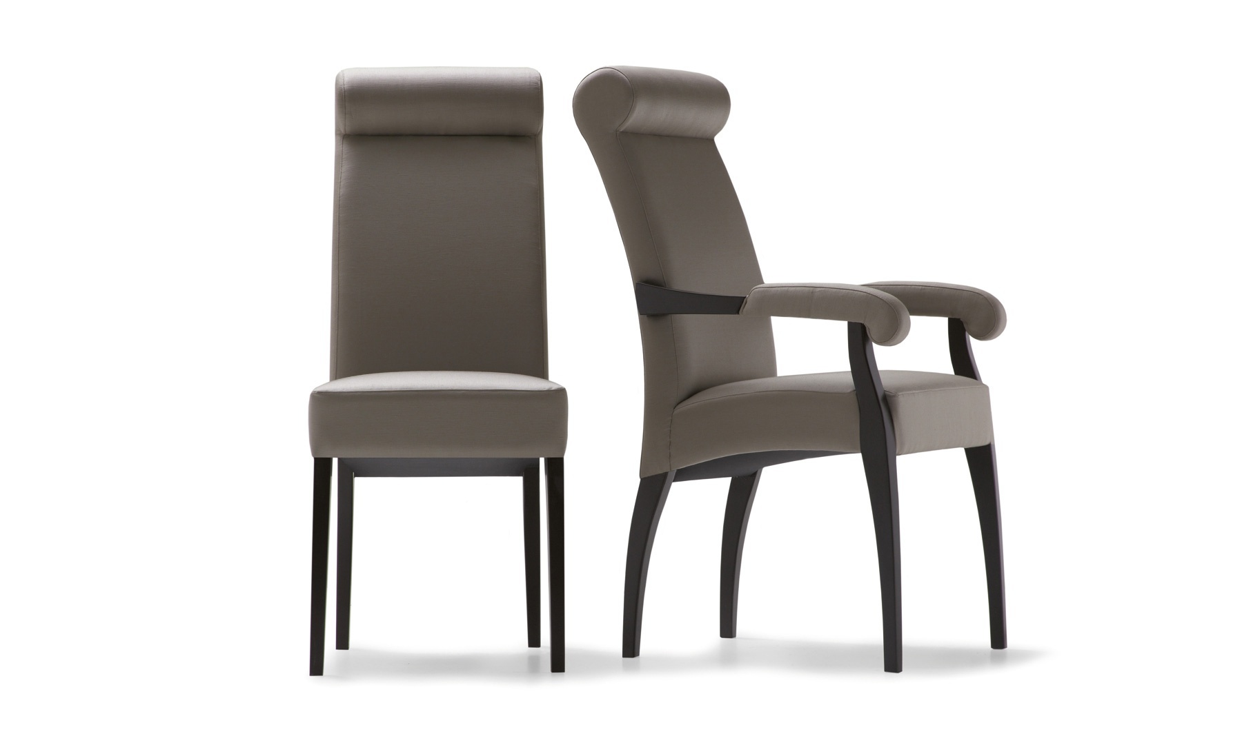 A chair from the Italian manufacturer of Contemporary Opera. The model without armrests and a high, soft back. The design is executed in art Deco style. A chair on a frame of wood. Upholstered in textile or leather based on manufacturer's catalogue.