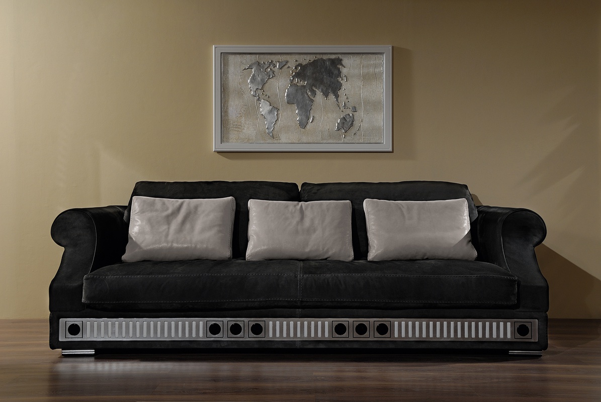 Sofa triple Confort Nouveau Italian manufacturer Vismara. The sofa in the fabric of dark grey color, the filler of polyurethane foam. The hem is decorated with metal panels. Color of sofa is black. Perfectly complement the interior of modern living room.