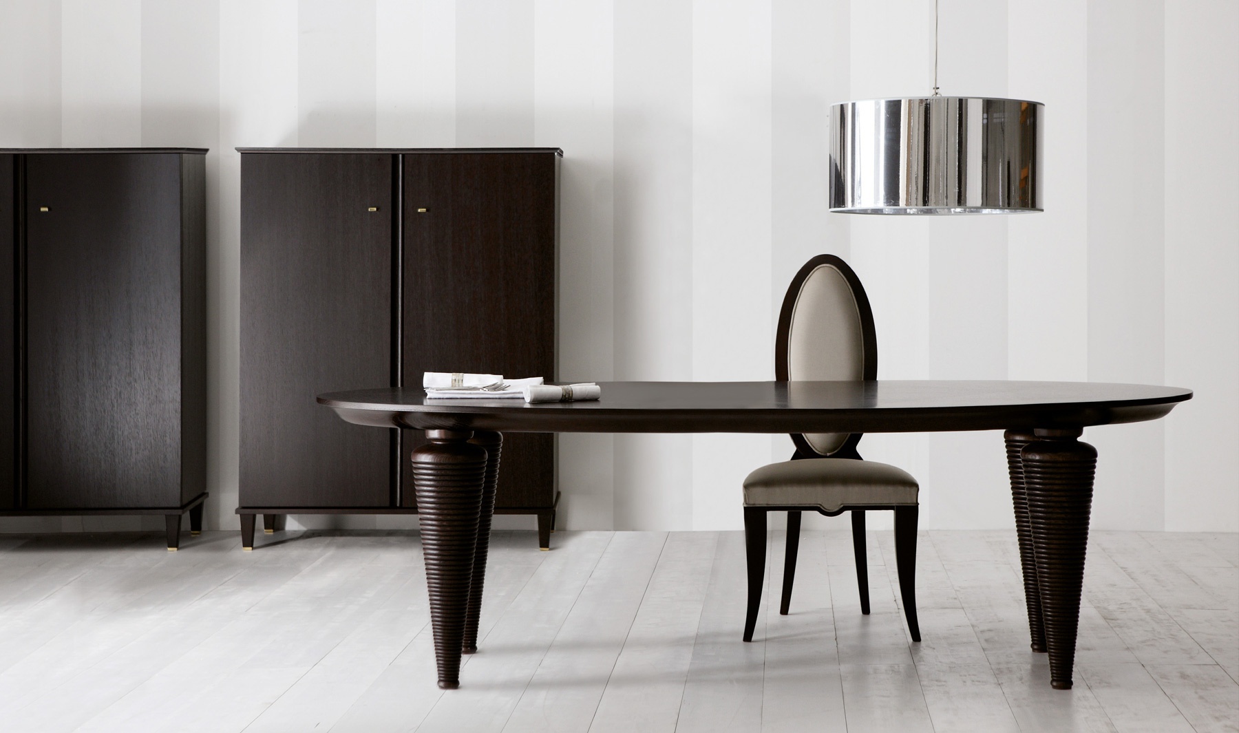 A chair from the Italian manufacturer of Contemporary Opera. The model without armrests and high back. The design is executed in art Deco style. Upholstered in textile or leather from the company portfolio. The frame is made from solid wood.