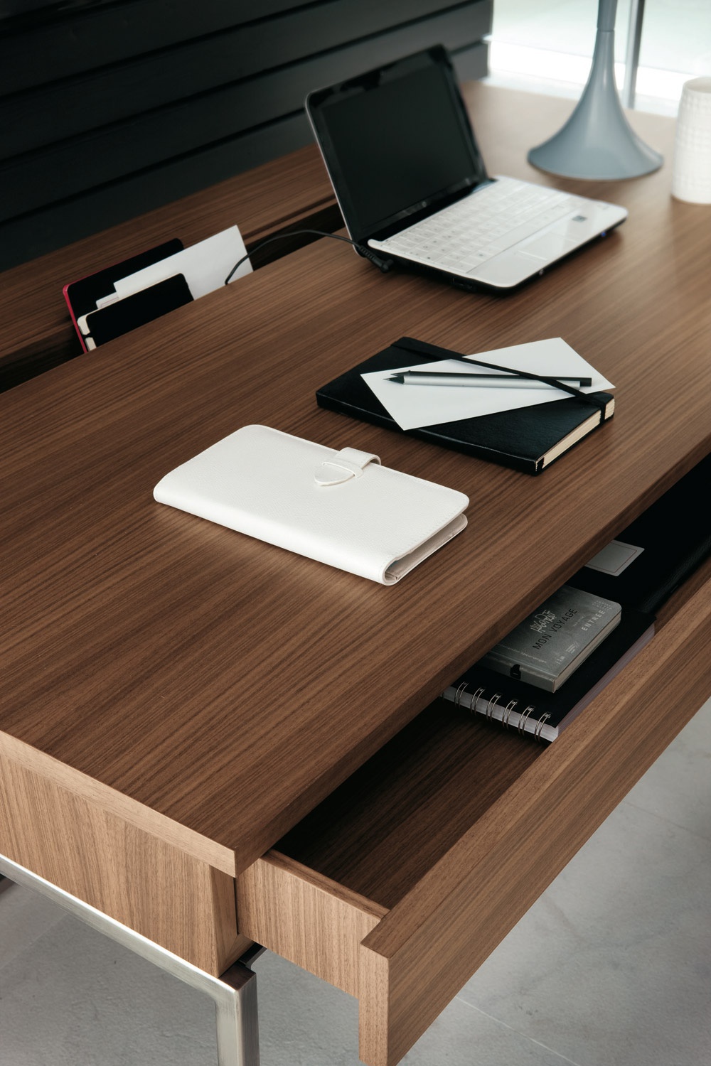 Writing Desk Kepler from the Italian manufacturer Porada. Model in walnut veneer on a metal frame with two drawers opening systems push-pull. Modern style, perfect choice for the office. Available finishes natural walnut, stained walnut or painted in color according to the manufacturer's catalogue.
