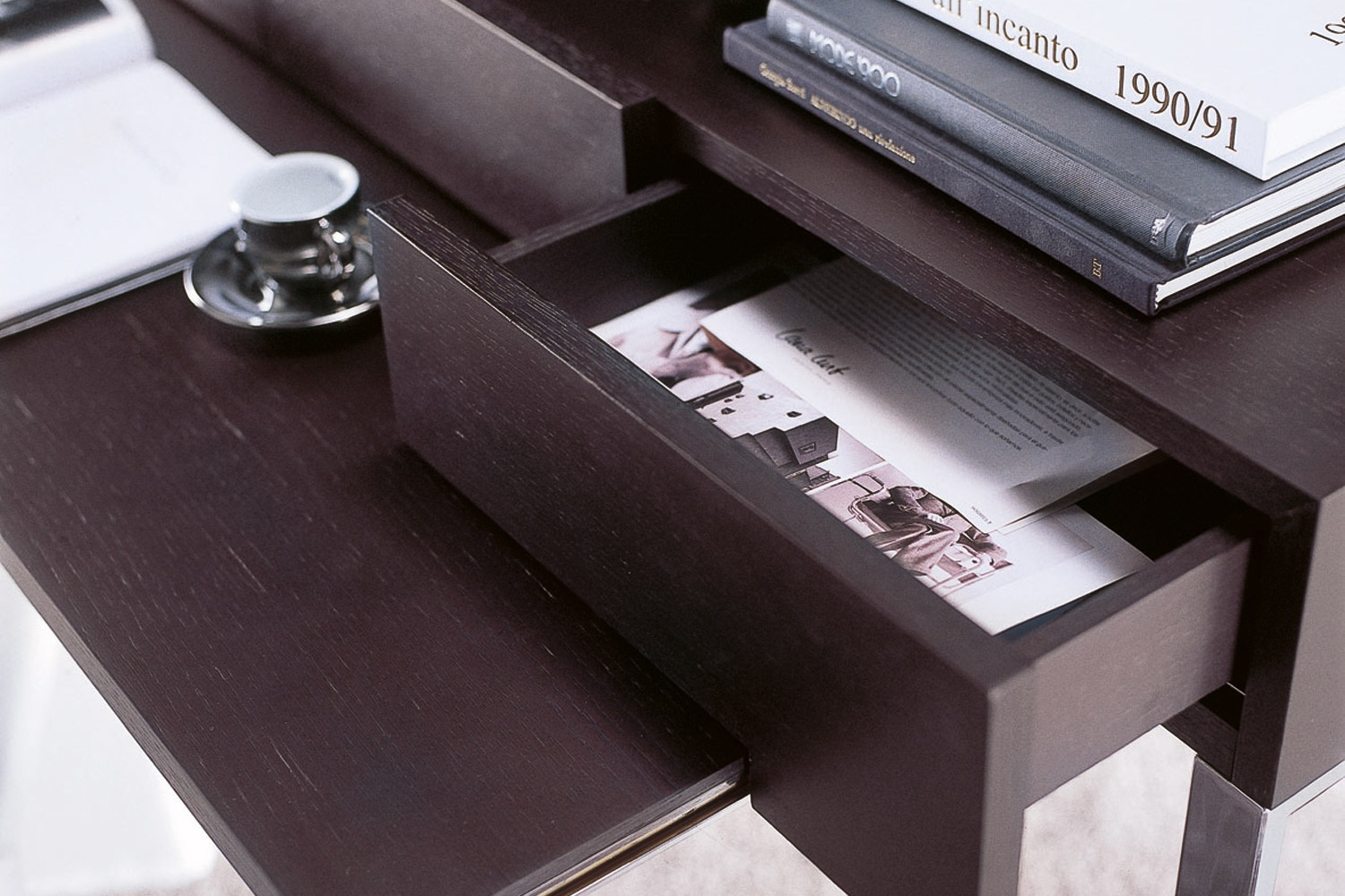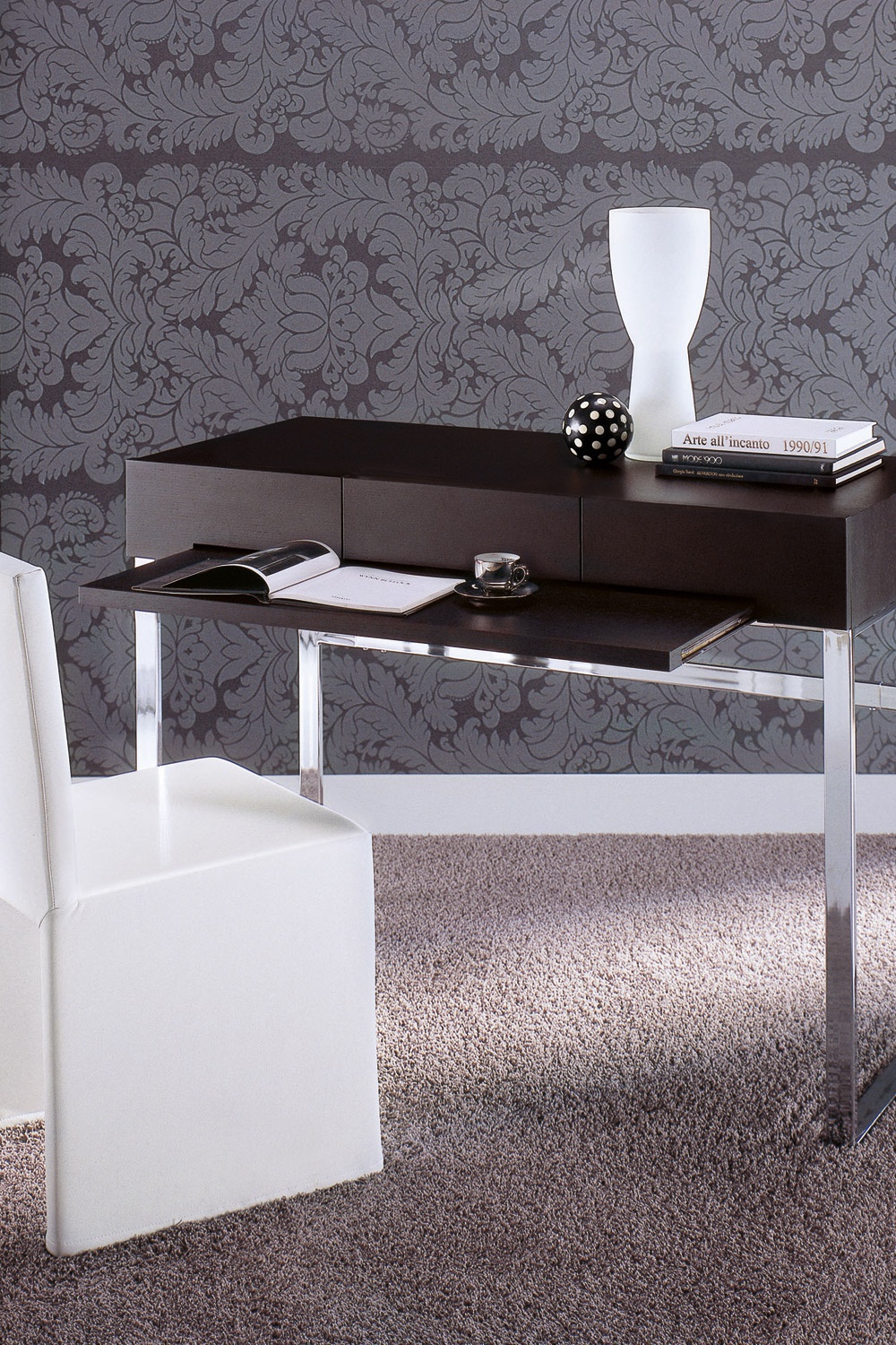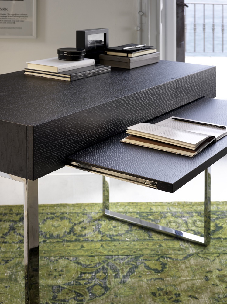 Desk Post scriptum from the Italian manufacturer Porada. The model of natural wood on a frame of chrome-plated steel with a sliding top. Modern style, perfect choice for the office.