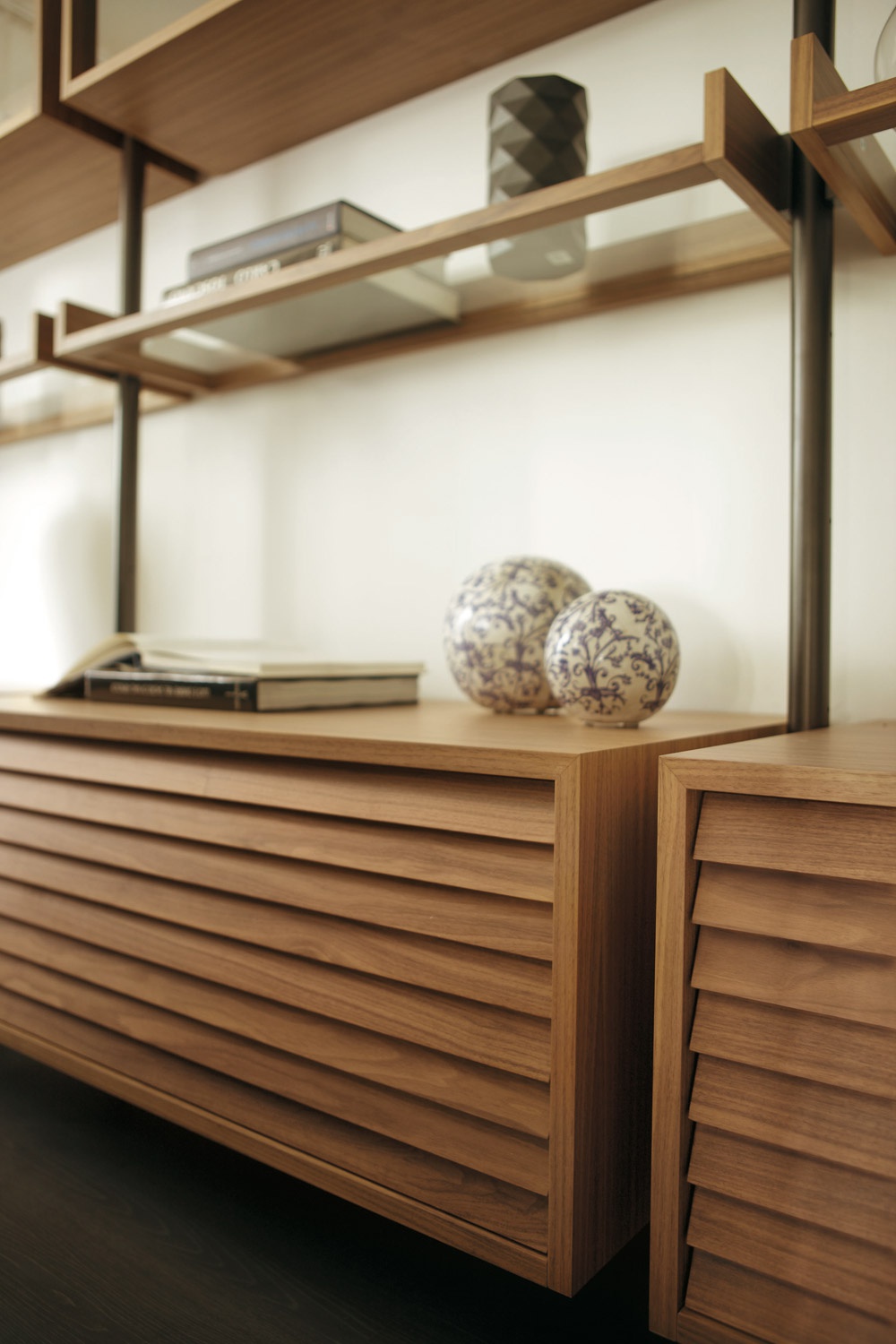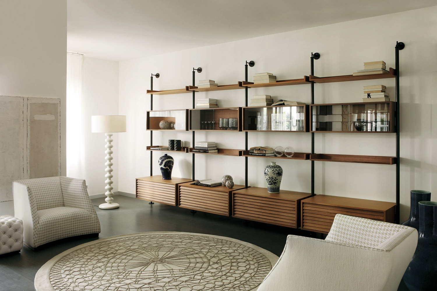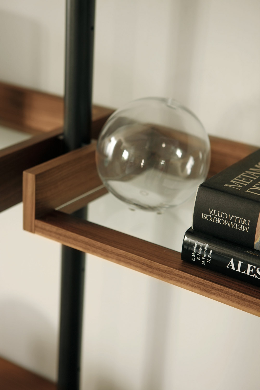 Ubiqua rack made of solid wood by Italian manufacturer Porada. The frame is made from solid wood with metal fittings to the floor and the wall or ceiling. And merchandise shelves with glass doors. Color in stock. The perfect choice for the modern interior.