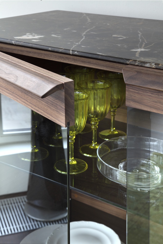 the body, doors: walnut tree doors, shelves: tempered glass accessories: stainless steel countertop: marble |