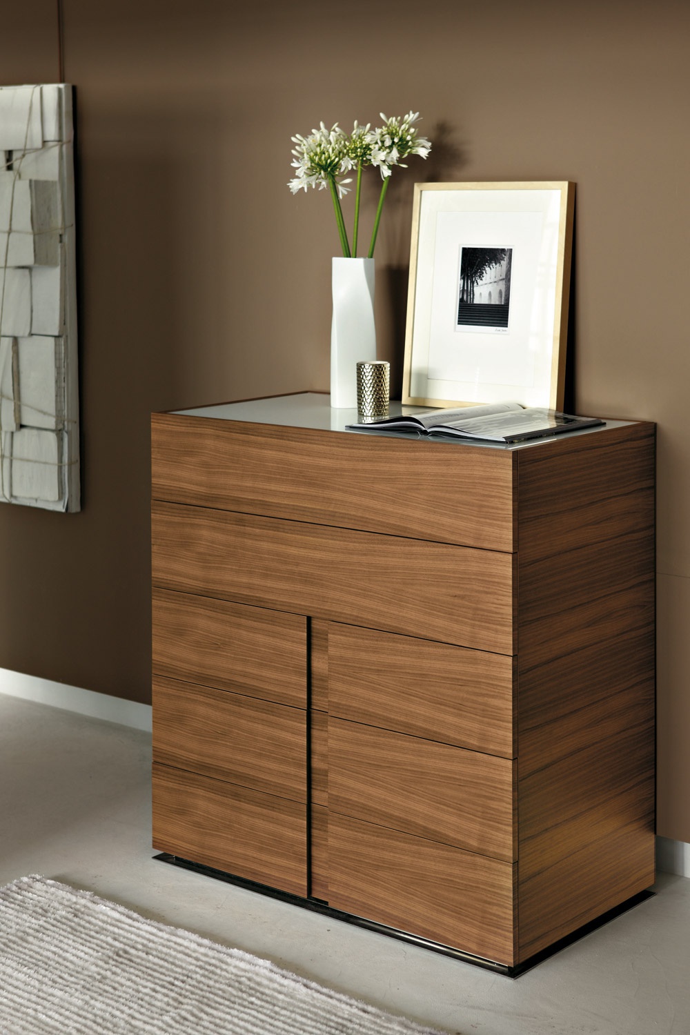 The Novella sideboard made of solid wood by Italian manufacturer Porada. The model is made of walnut with drawers on metal legs. Available in the colour of natural walnut. Glass top can be painted in white or black color.