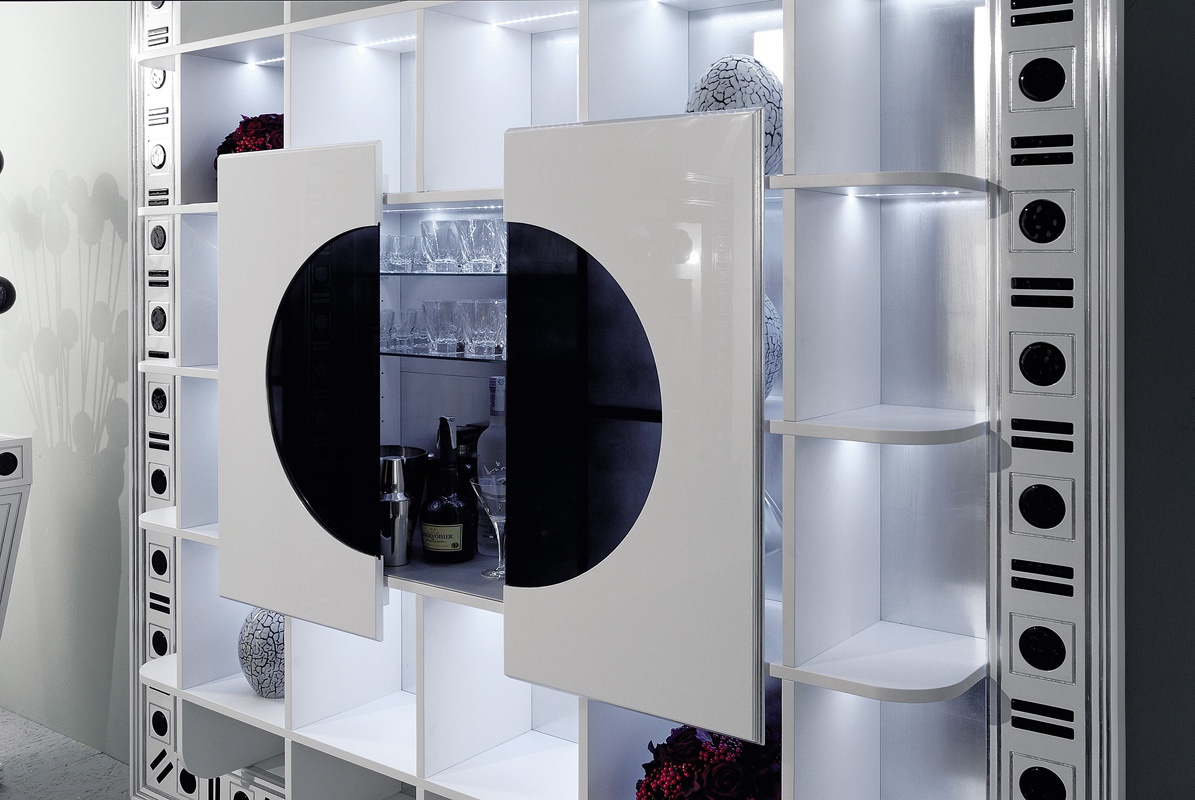 Wall bar The Container Bar Italian Frame manufacturer Vismara. Wall bar in a square frame with sliding doors. Color in white with black accents and neon lighting.