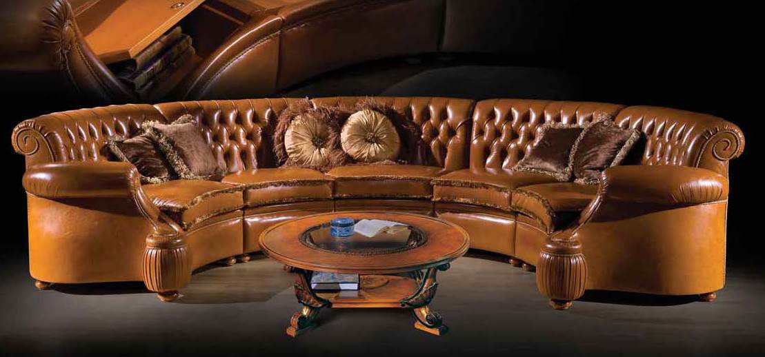 Semicircular sofa for the living room from Italian manufacturer Ezio Bellotti. The frame and legs are made of solid wood. Upholstery leather from the company portfolio. In addition, the offered pillow. Colours in stock.